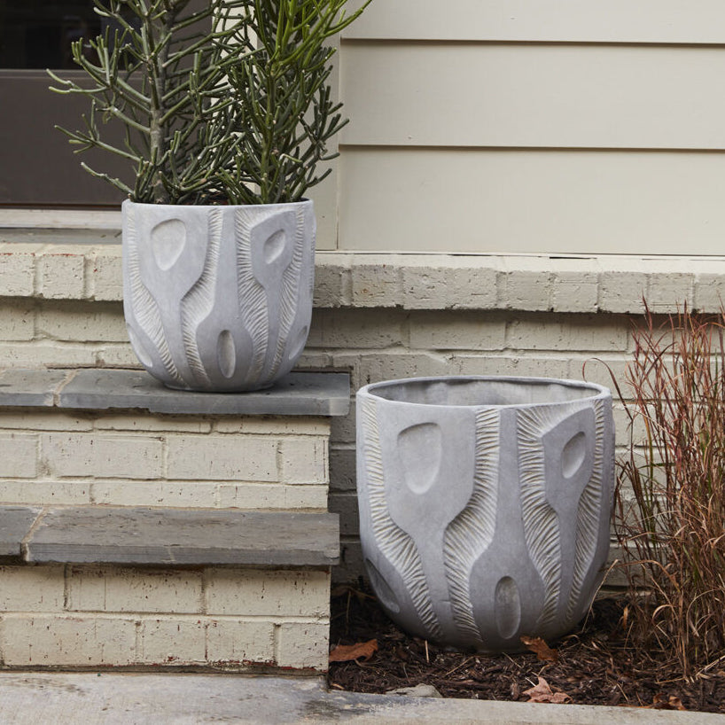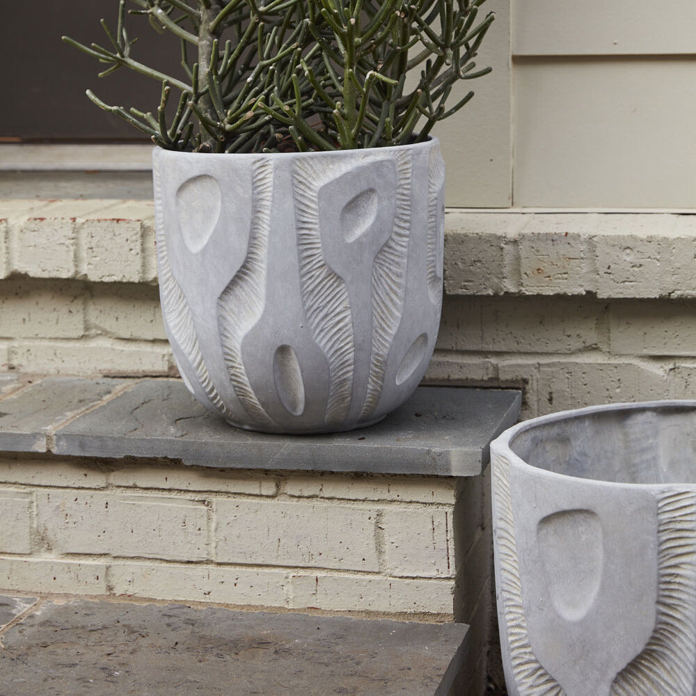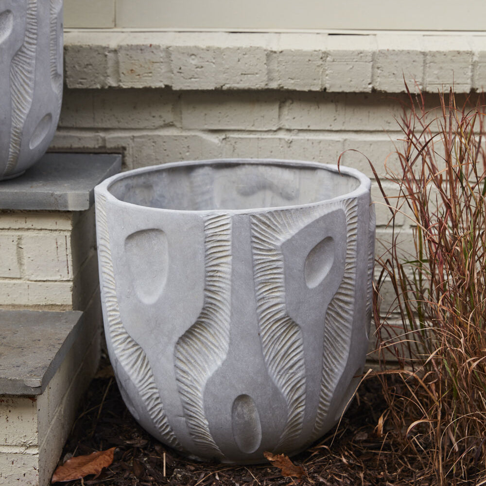 The abstract shape & style of the ceramic bas-relief Accra Pot offer an artistic quality to home decor. This piece features organic shapes & linework in relief for dimension & texture. Variation will occur from piece to piece. Watertight & large-scale, this pot is ideal for an indoor tree, or it can also live on an outdoor patio for a sculptural accent.