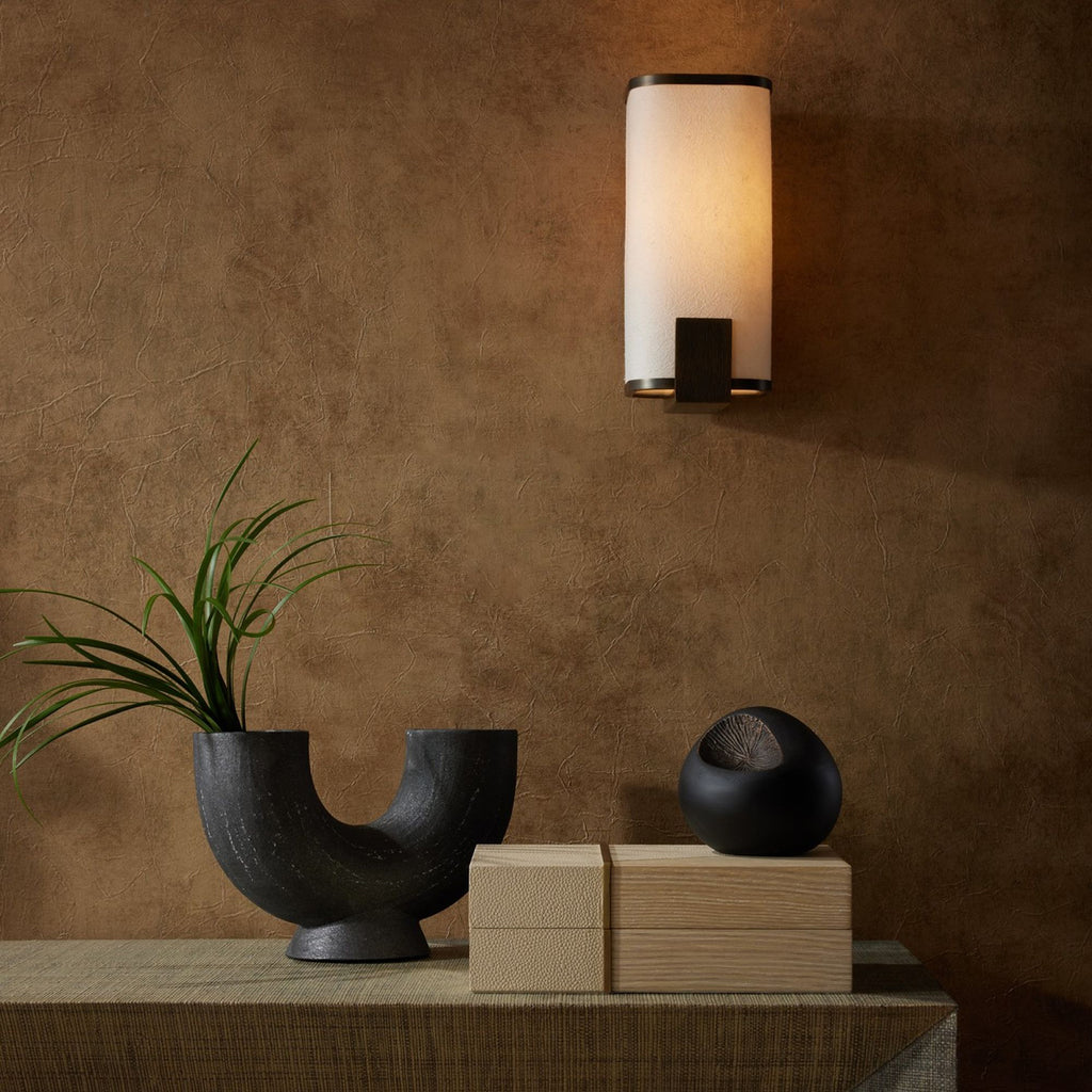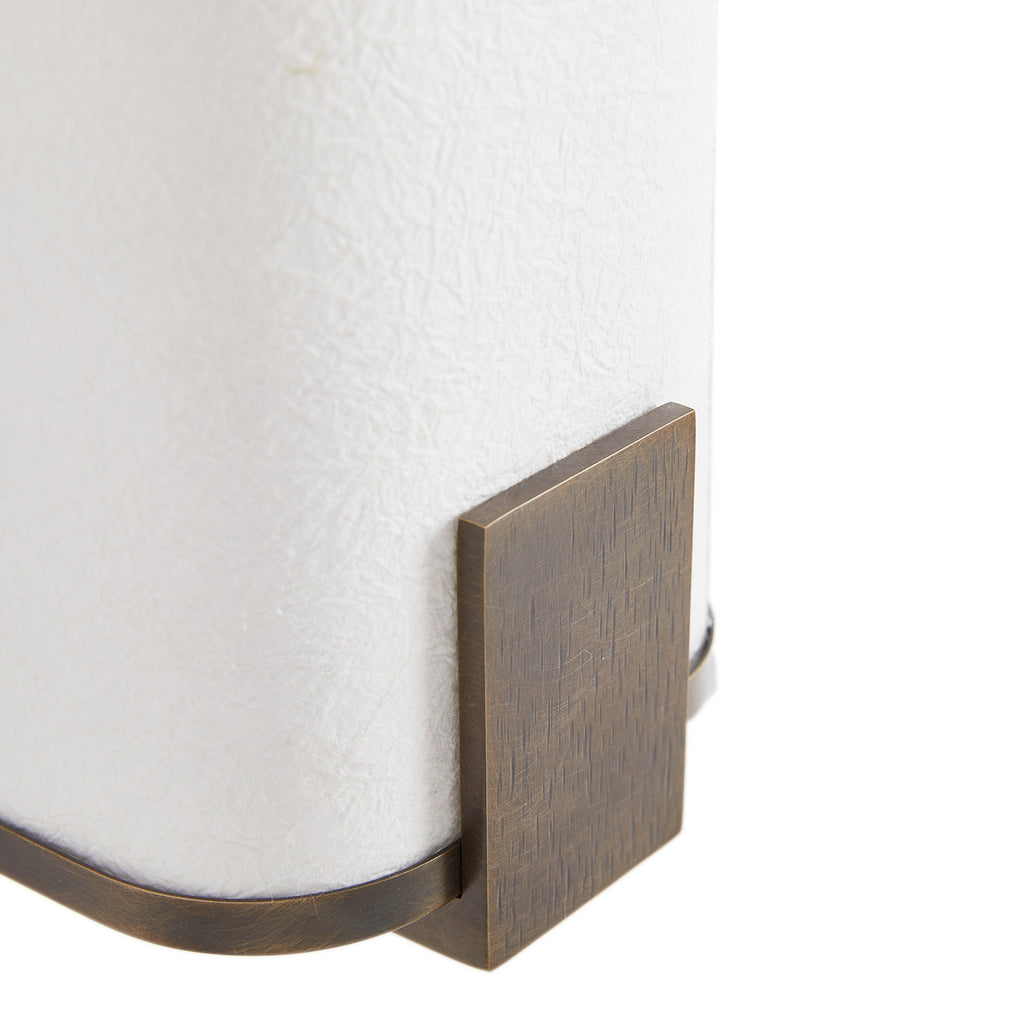 When a hint of zen is required, the minimal Arteriors Braxton Wall Sconce fits the bill. Supports of solid steel finished in english bronze clasp a delicate shade of white crinkled paper. Organic in feel, with elegant soft edges. Damp-rated, although limited covered outdoor conditions may affect finish. Finish will vary.