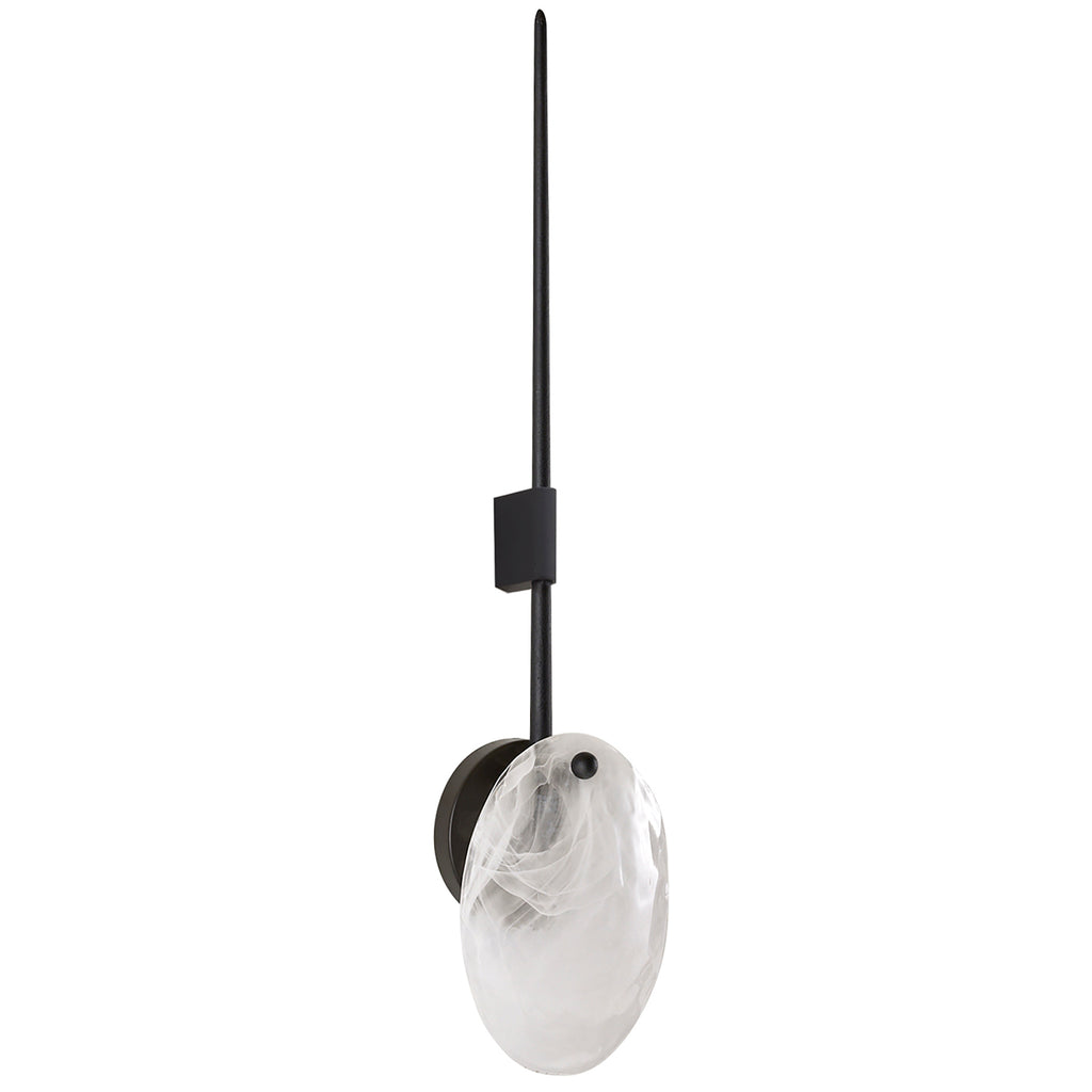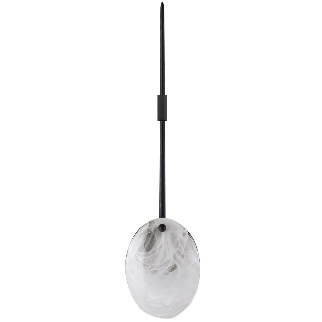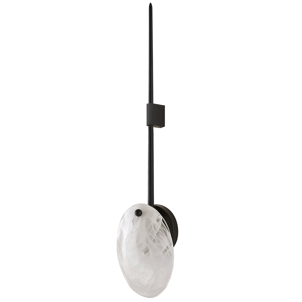 A striking spear contrasts an opal swirl glass oval. The piercing gesture of the blackened and hammered iron hardware provides a textural counterpoint to the convex shield in this horseshoe crab-inspired fixture. Finish will vary.