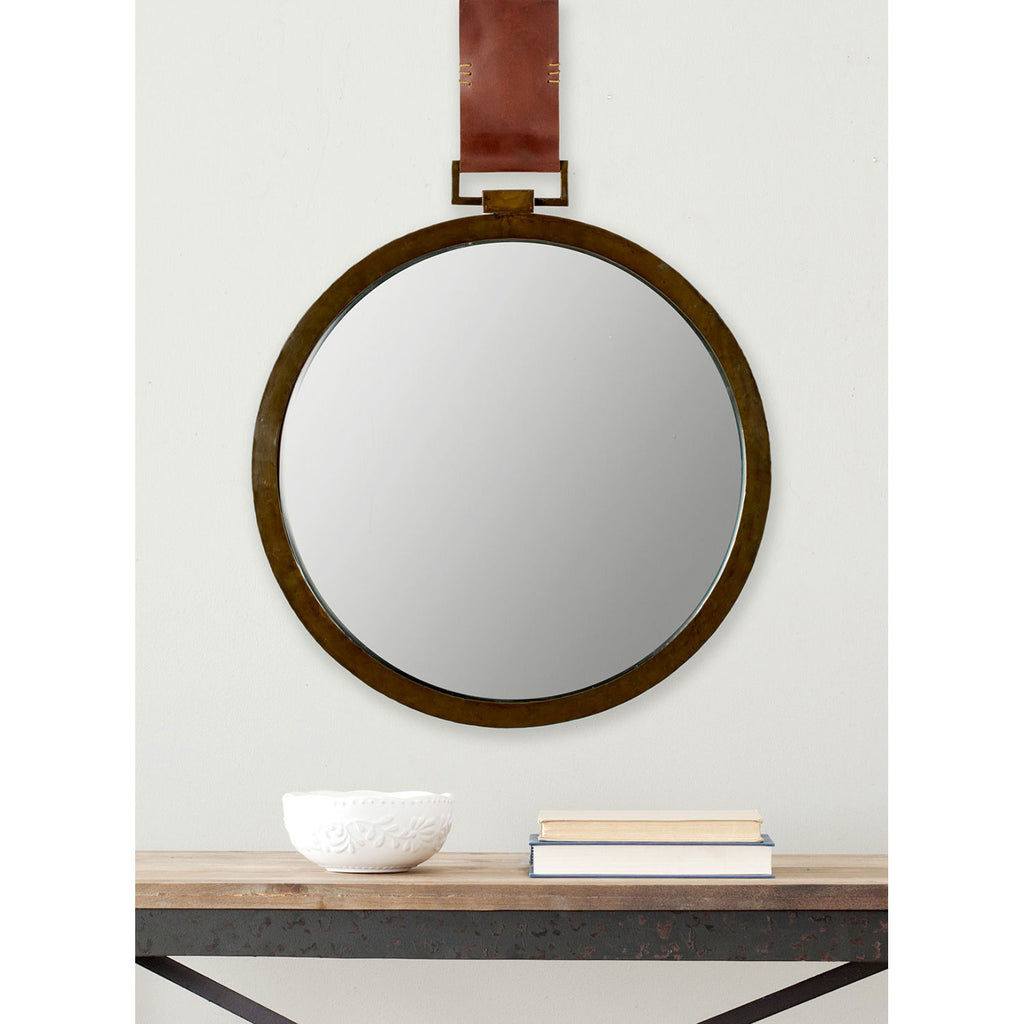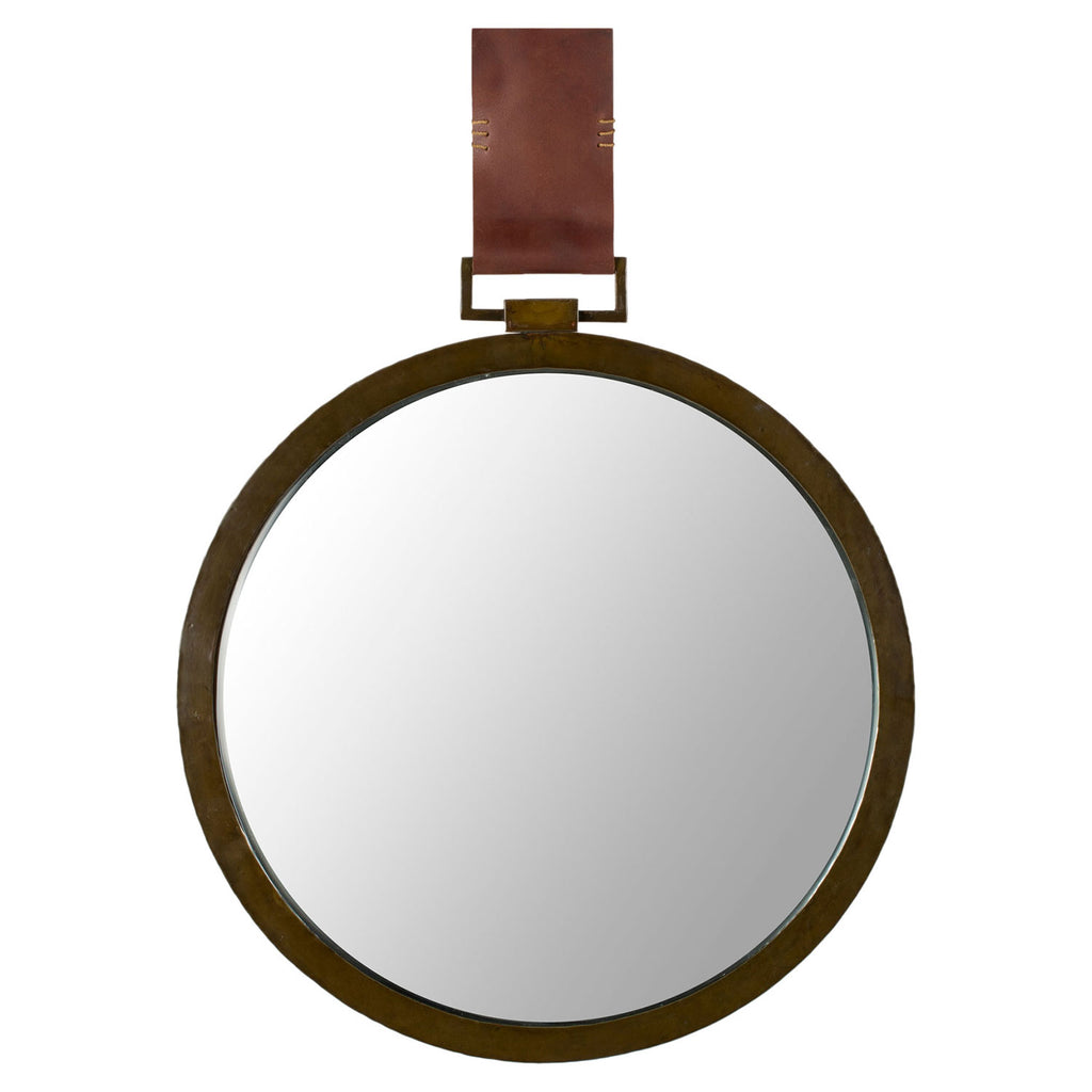 Inspired by vintage pocket watch finds at the flea markets of London and Paris, the warm amber beveled mirror with leather strap gives instant character and charm to any room with the simple lines of its artisan hand-wrought iron frame.