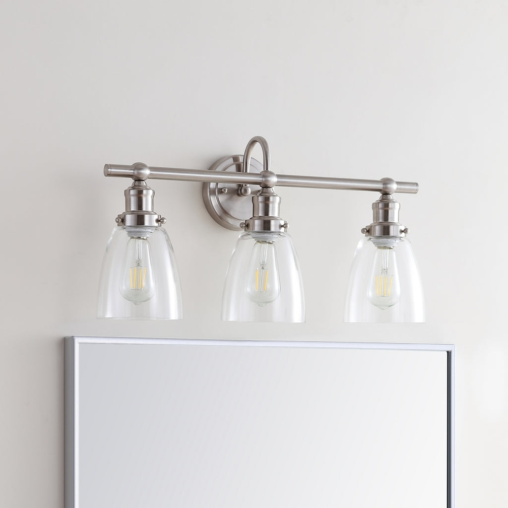 Transform any bathroom into an instant spa with this classic three-light bathroom sconce. Designed for form and function, its metal construction features a Nickel finish that shimmers next to the ample lighting diffused through its Clear glass shades.