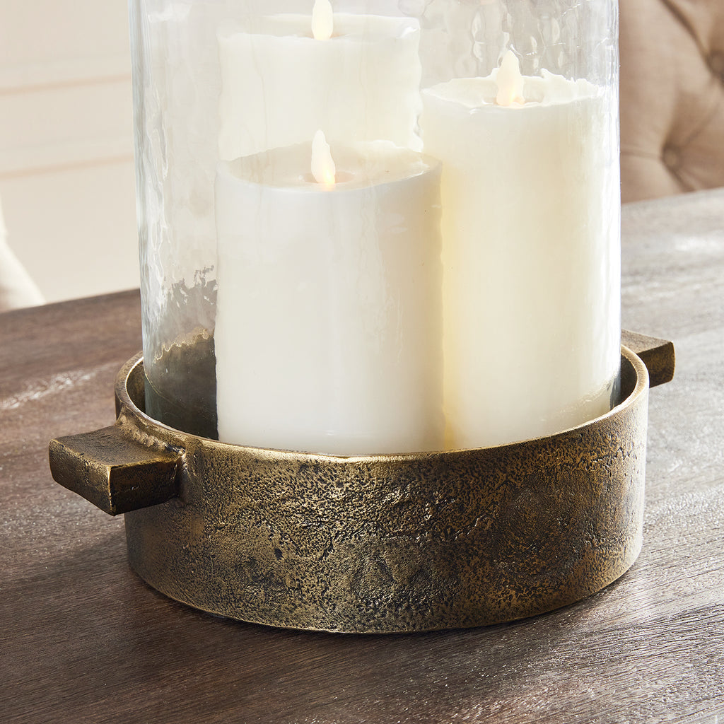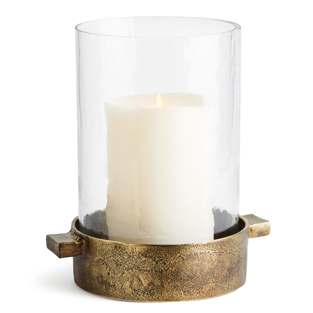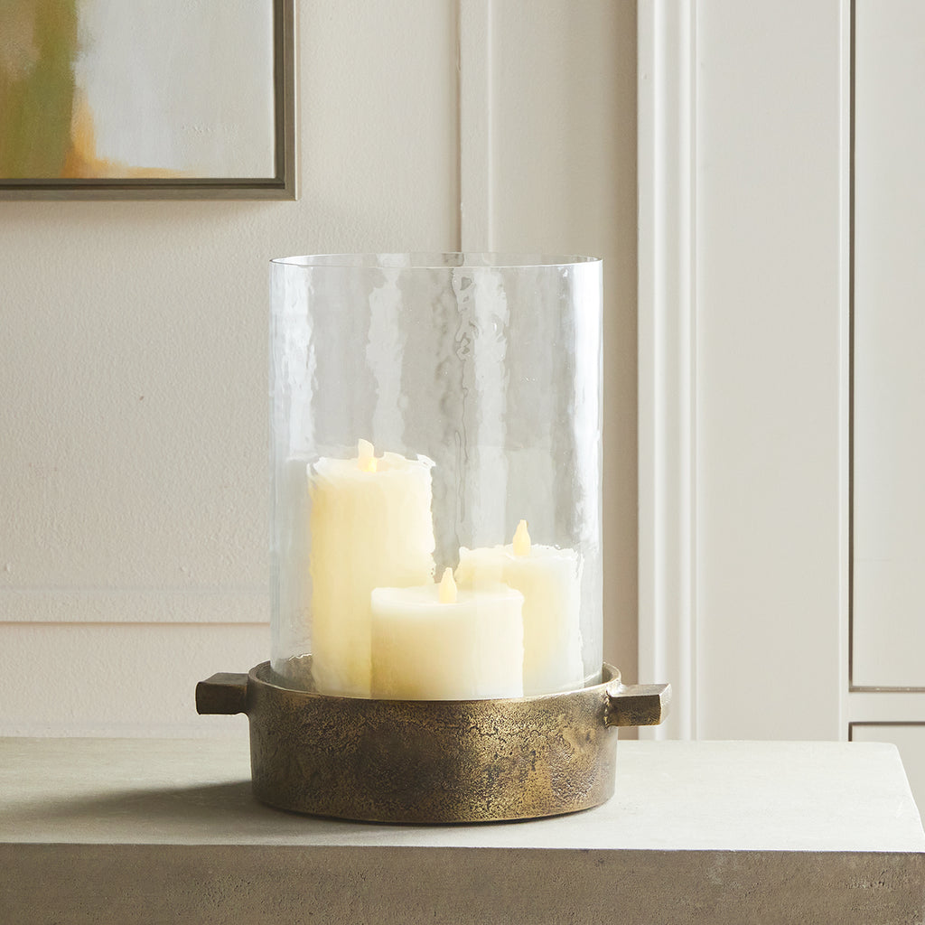 Made of hammered glass and cast aluminum, this hurricane has a classic look. The simple handles add a graphic element and a place to grip. The antique brass finish plays well in transitional spaces.