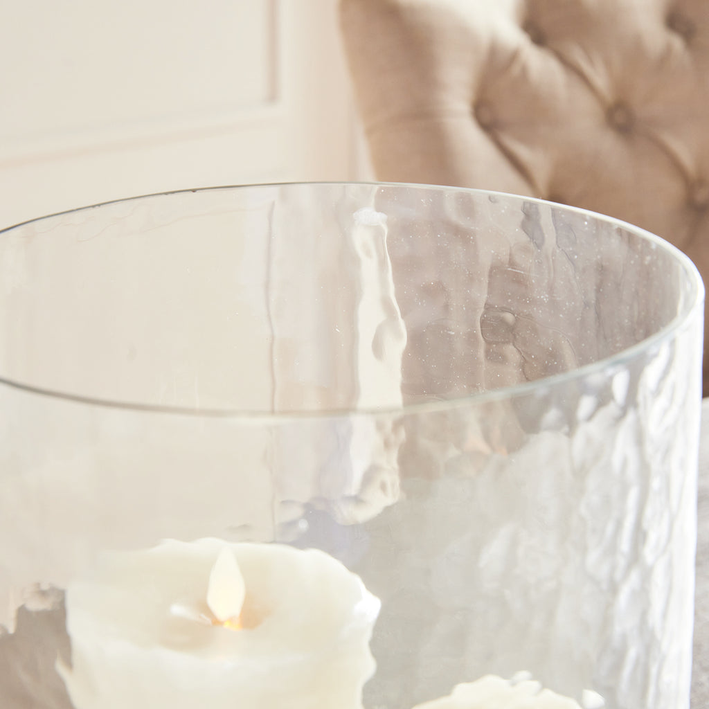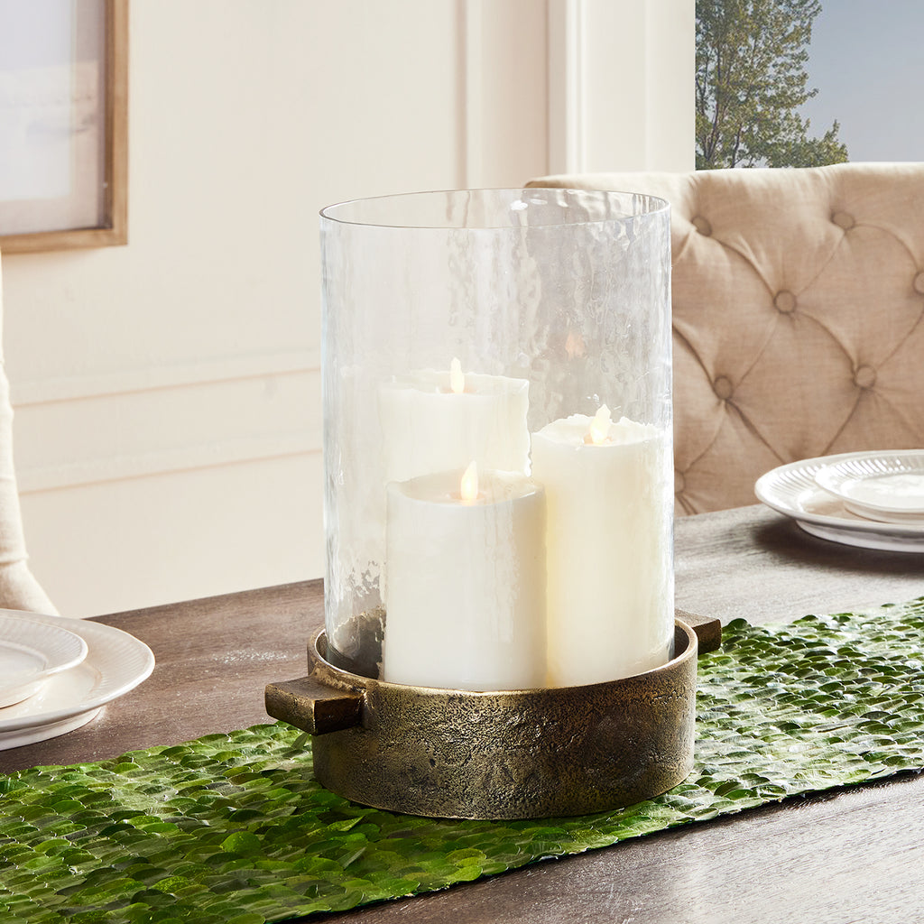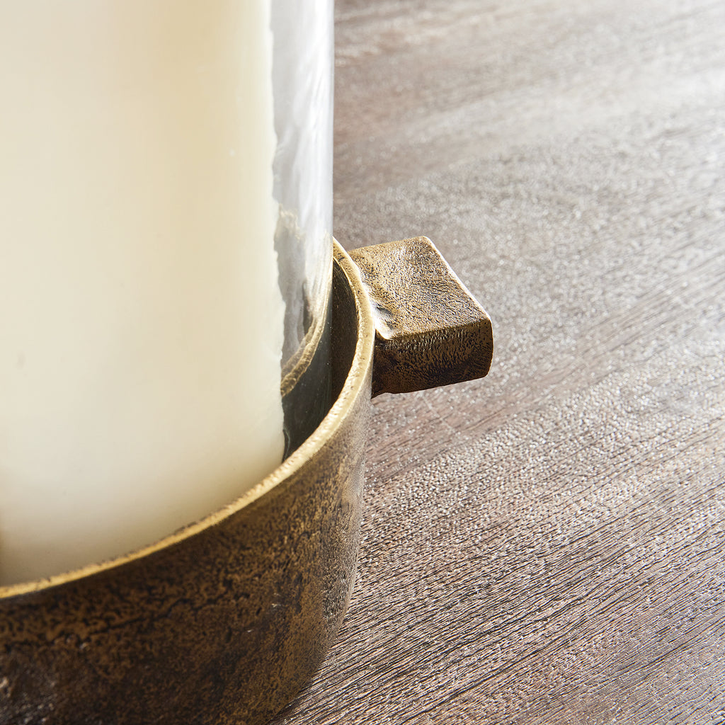 Made of hammered glass and cast aluminum, this hurricane has a classic look. The simple handles add a graphic element and a place to grip. The antique brass finish plays well in transitional spaces.