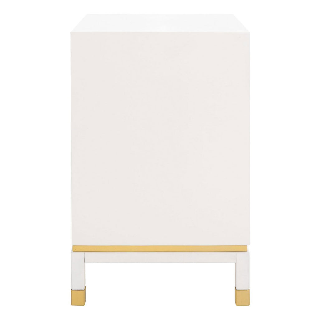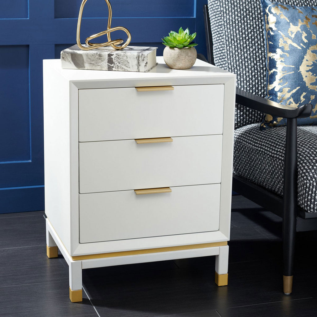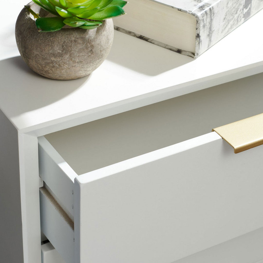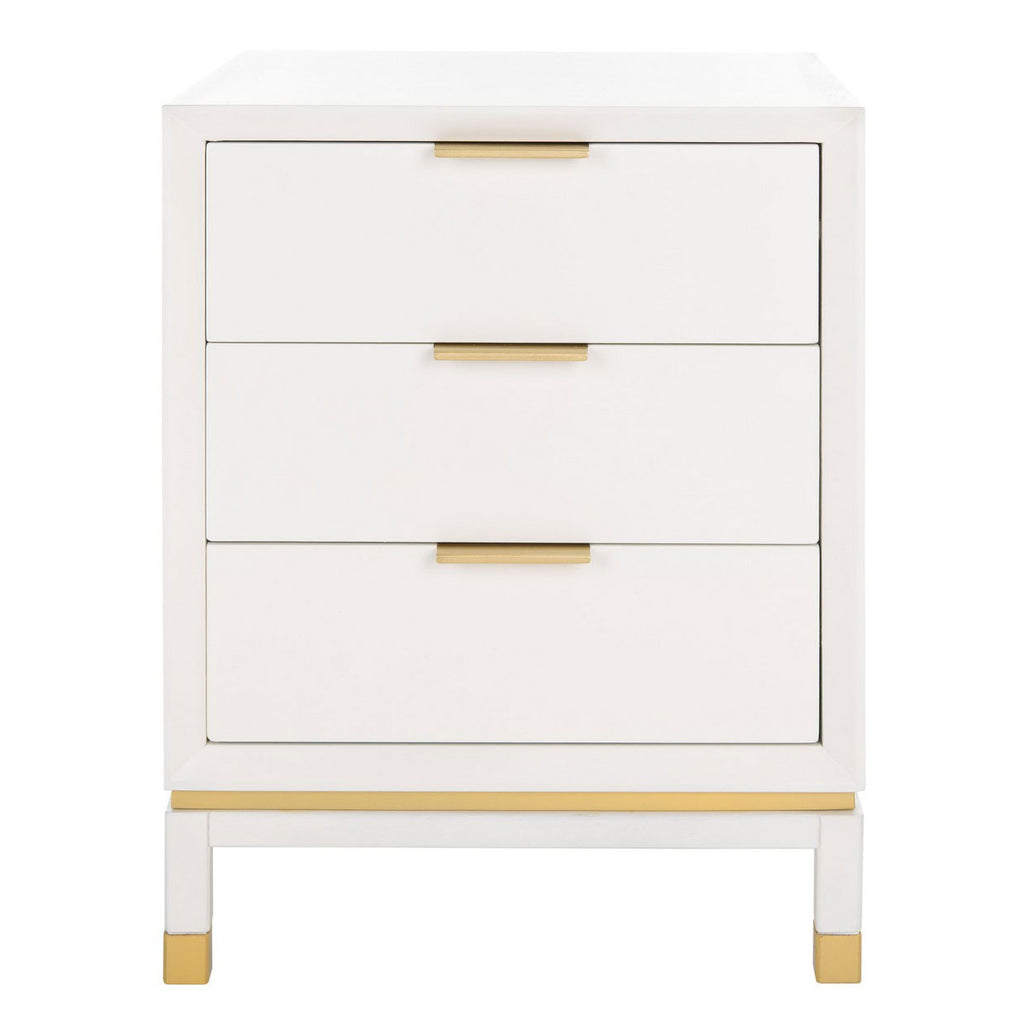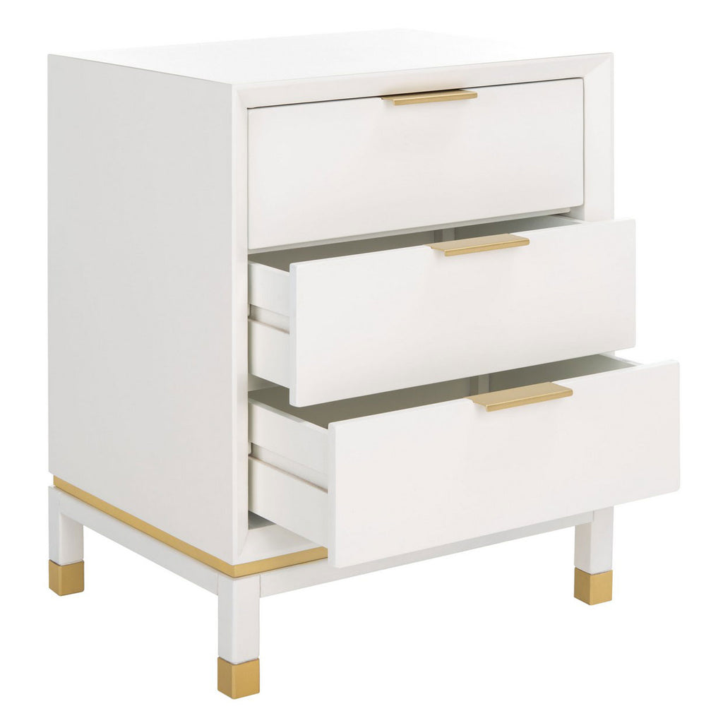 Refined yet glamorous, this accent table elegantly eye-catching without being ostentatious. The clean white wood frame is given subtle artistic depth with the slim concave band above its gold-capped legs, while three drawers make for simple, sophisticated storage.