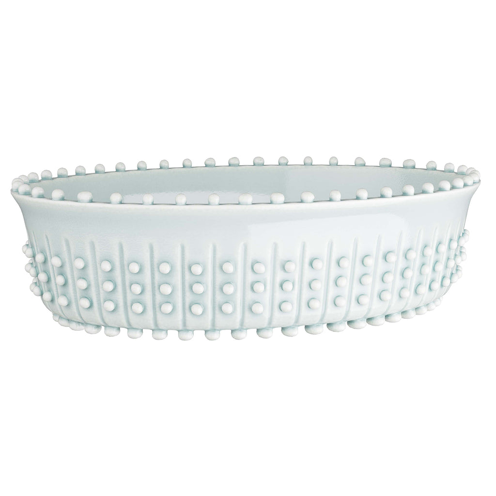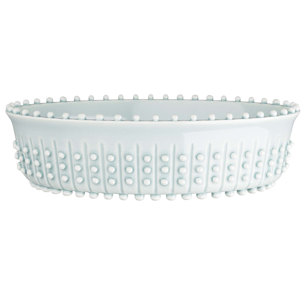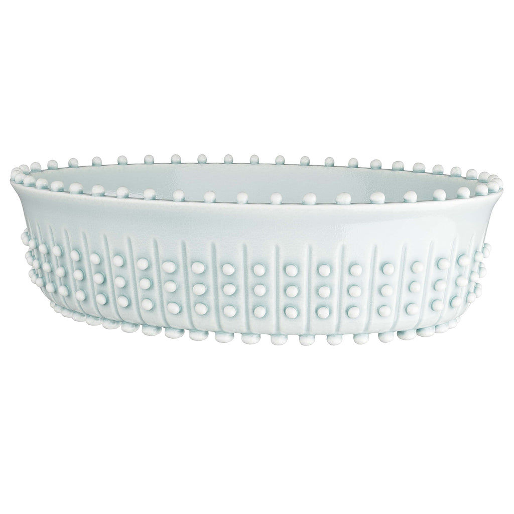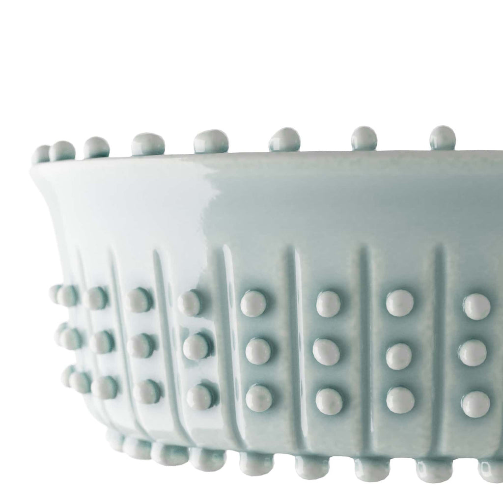 A ceramic centerpiece in a celadon finish, doused in soft hand-applied beads for a unique design. Finish will vary.
