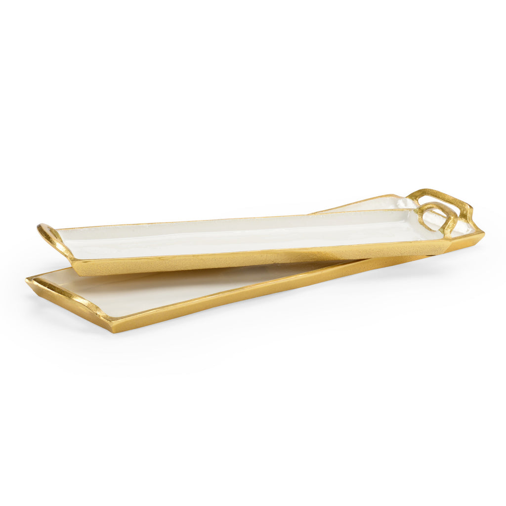 The Chelsea House Enamel decorative tray set adds an unexpected touch atop a mantle or table. Use this piece to show off your favorite collectibles or enjoy it as a standalone accent. Large And Small Enameled Trays With Metallic Gold Outside And Handles. Consider pairing with the Chelsea House Enameled bowls, available separately.