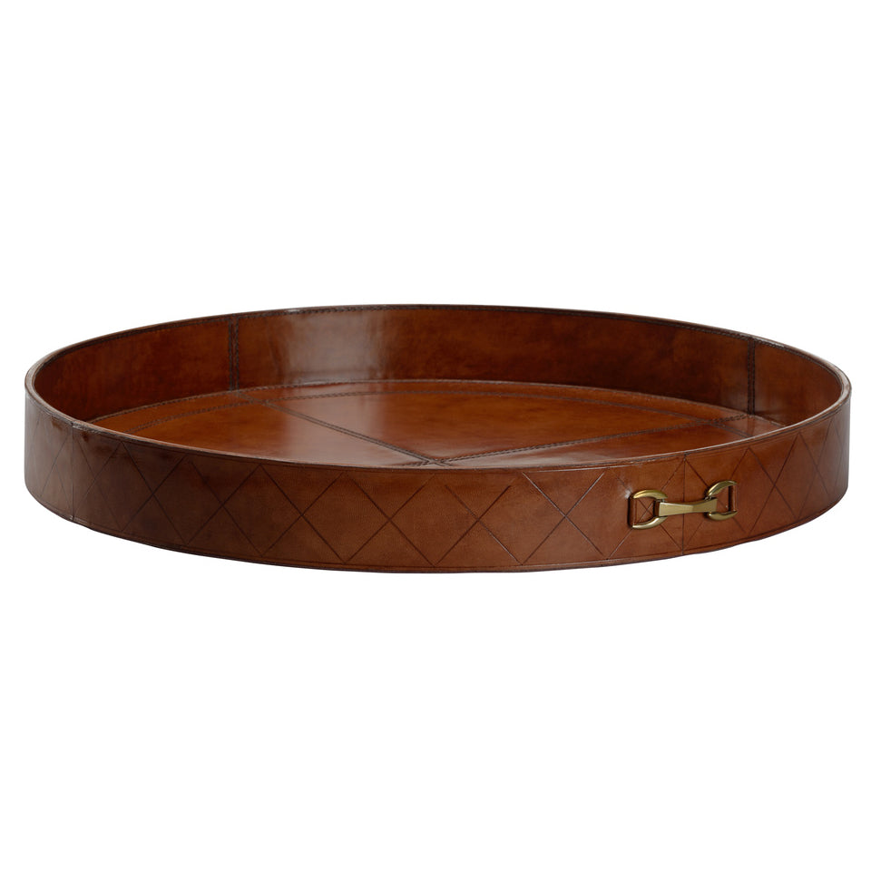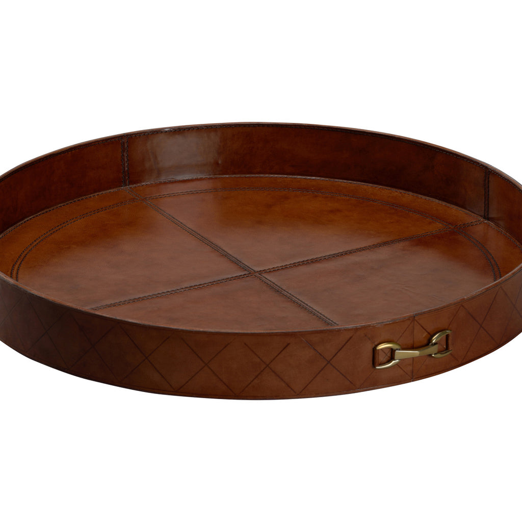 A sleek, circular design with stitching details on tan leather brings a timeless look to the Round Leather Tray. The tray are perfect for display on a large ottoman or used as a bar trays.