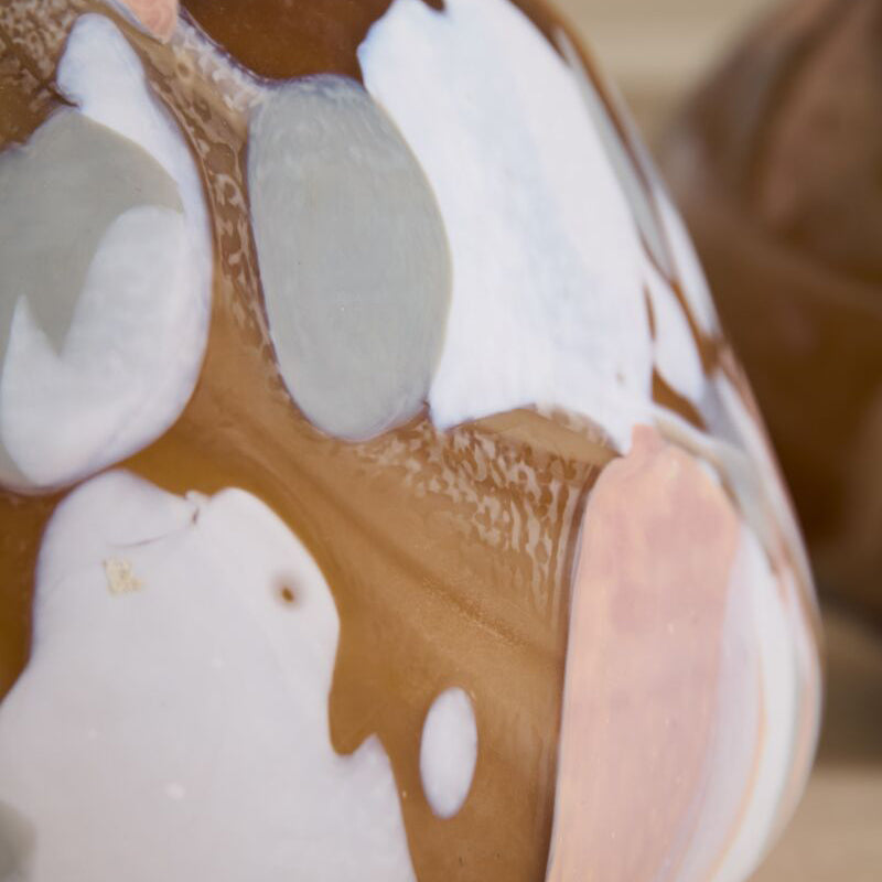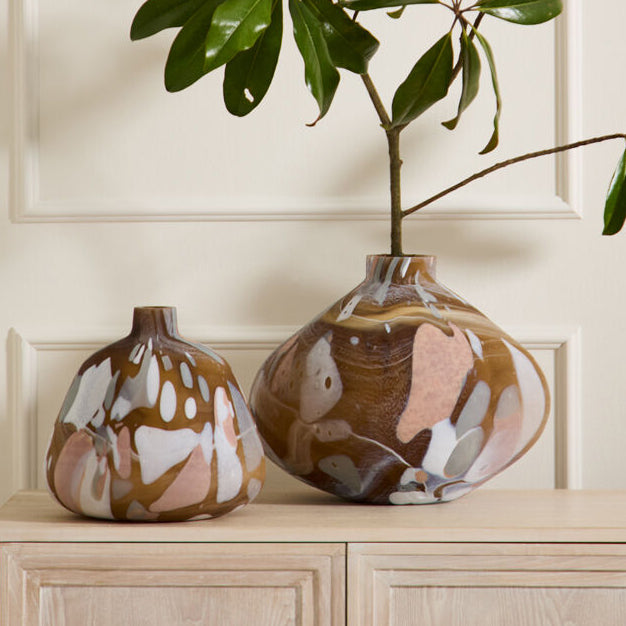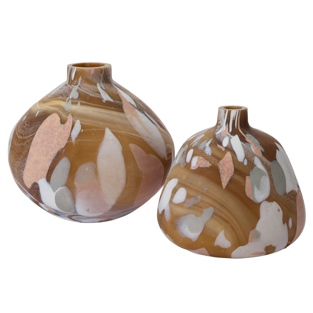 Like a marbled stone vessel, the chip molded, mouth-blown, solid soda-lime glass Color Theory Vase features a warm amber brown surface, matte frosted finish, & large, mosaic-like shapes layered into the surface in shades of white, pink, & tan. This beautiful home accent piece offers an organic bottle shape, & each one has a unique pattern. Style with a few statement stems or as a sculptural, decorative art piece on shelves.