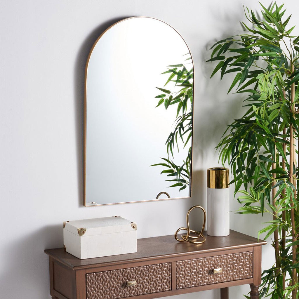 The understated grandeur of this wall mirror makes it a majestic finishing touch for any room. Ideal for visually opening small-space living areas, the classic arched silhouette and slim gold border are absolutely timeless.