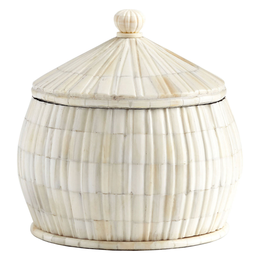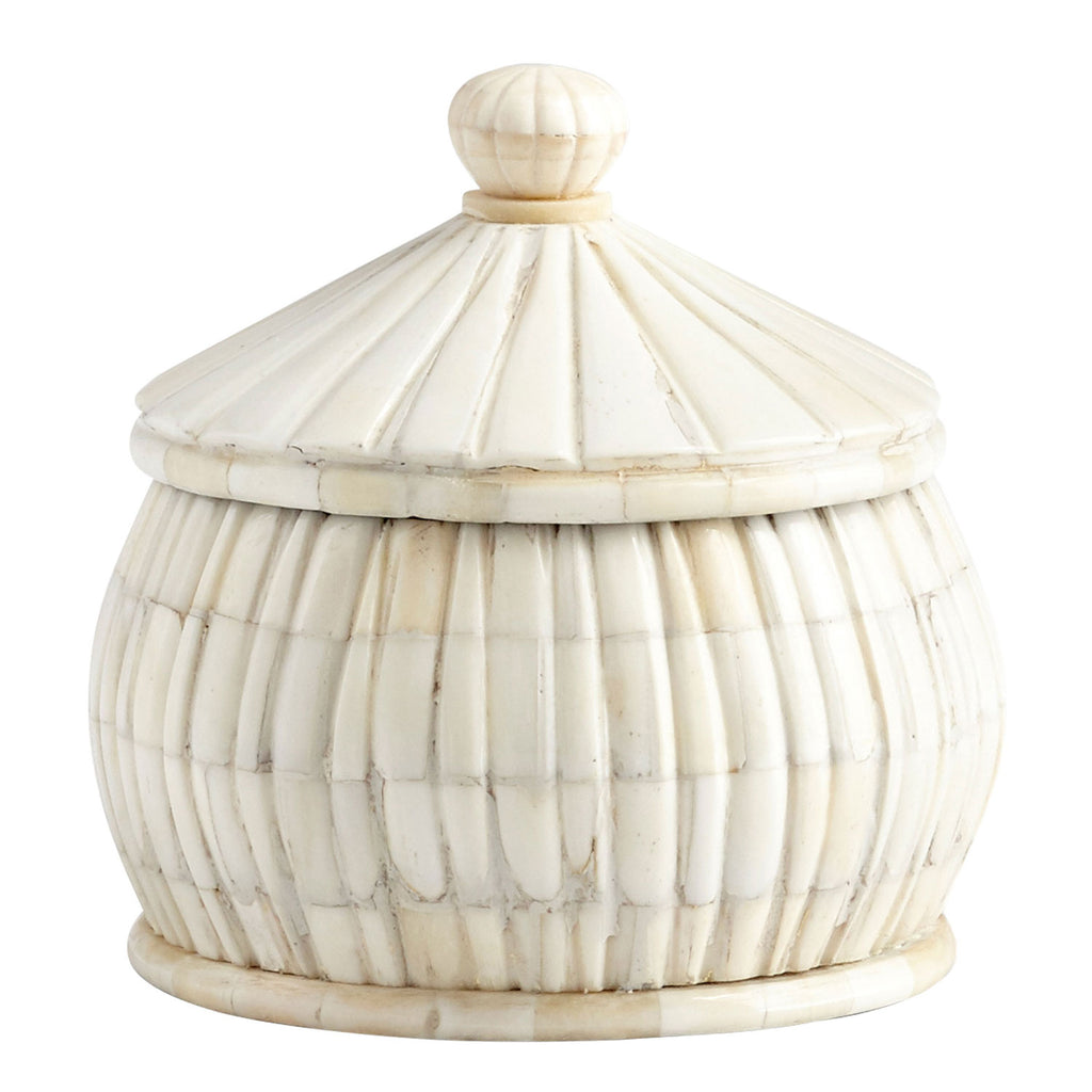Give any room an eclectic boost with a lidded jar from Cyan Design. This unique storage décor offers versatility and function while meshing with your distinctive style. Bone and wood take an Asian inspired shape to new levels. This bone white container is perfect for holding jewelry or other personal items in a guest bathroom.