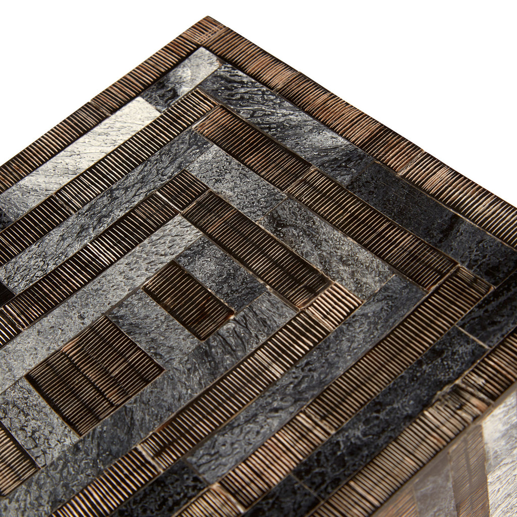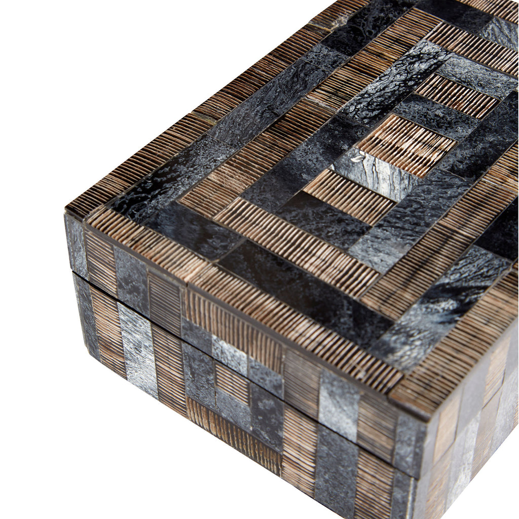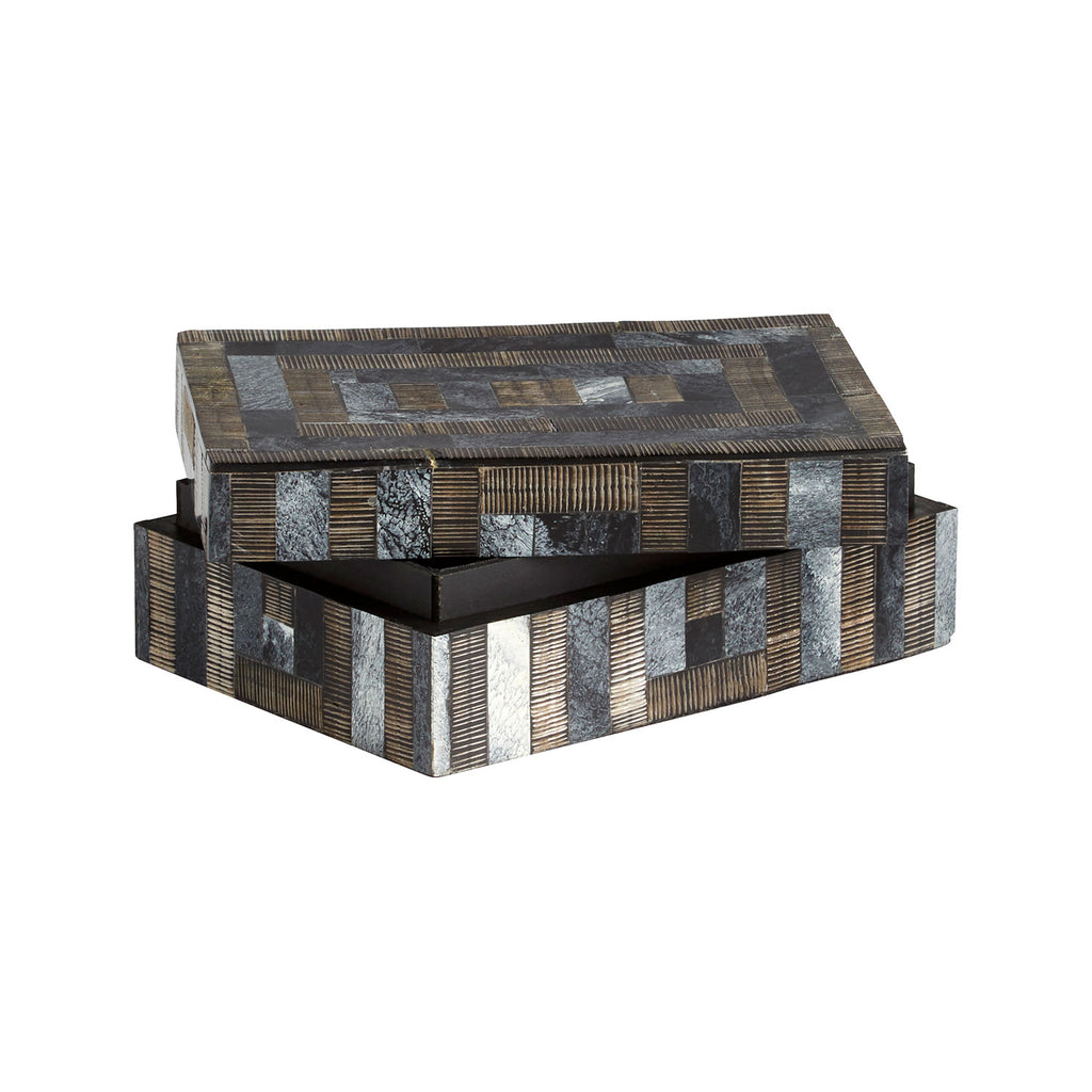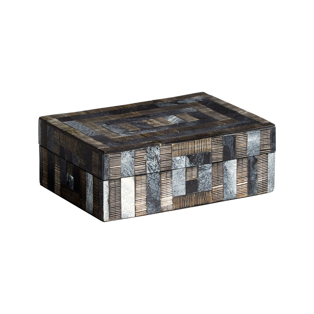 Cyan Design boxes fit right in to eclectic interior themes, blending functional storage with distinctive design. Offering protection and privacy in style, a box is the perfect addition to store belongings and clear clutter. The Cyan Design Southampton container possesses a maze-like design totally made of geometric designers with hatching patterns. The design is thoughtfully complimented with a four-tone analogous palette. This tabletop accessory is available in a small and large option for added versatility. Display on a bedroom dresser, powder room counter, or sitting room coffee table to add a natural elegance to your ensemble.