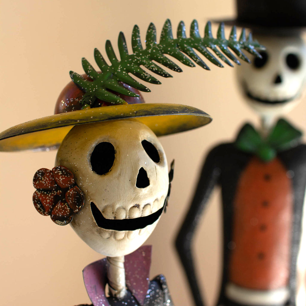This couple is dying to entertain at your house. This day of the dead couple completes any Halloween or fall decor. He is dressed in a top hat and pumpkin vest while she sports an elegant dress and feathered hat.