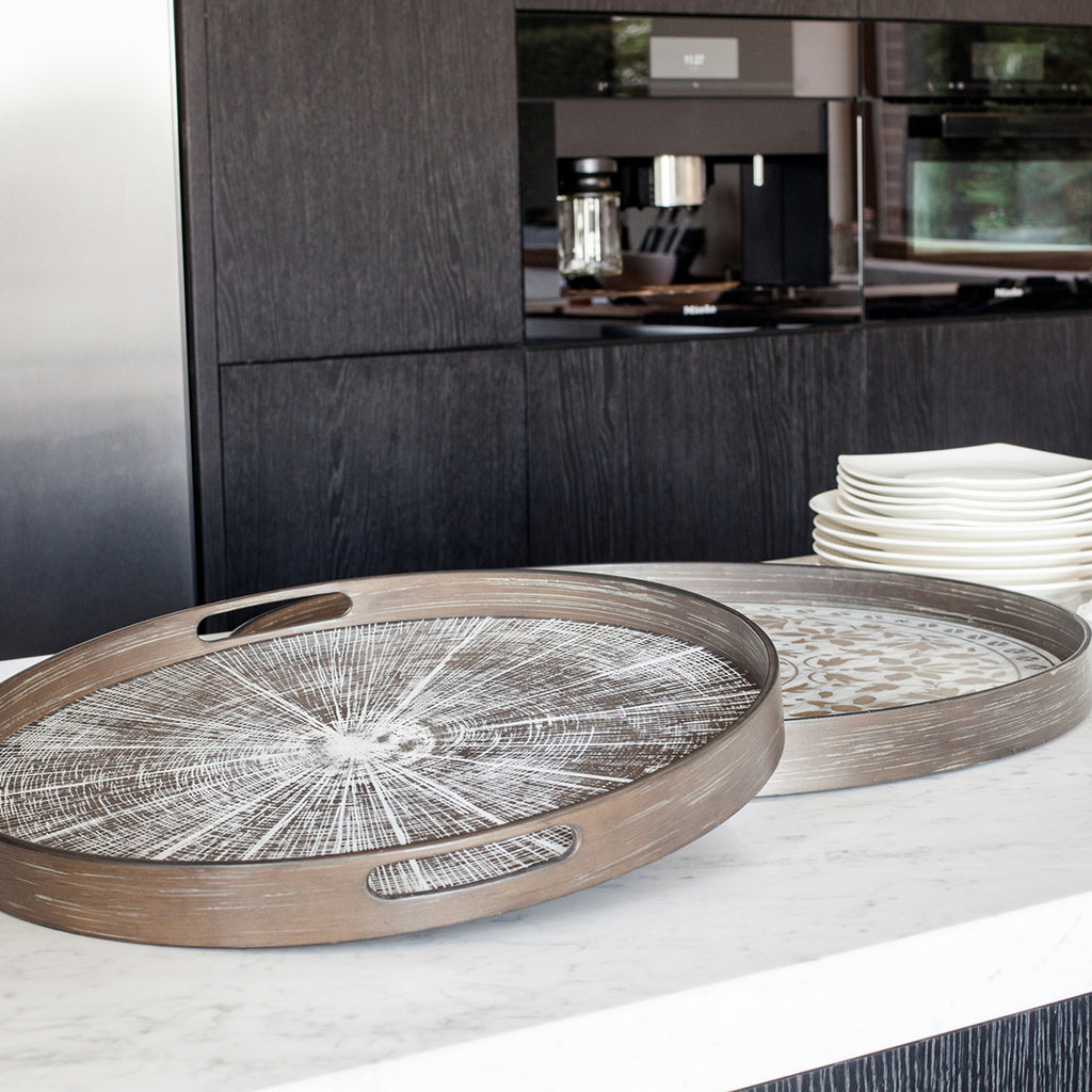 A subdued color palette meets captivating motifs inspired by nature and travel. This White Slice wooden tray experiments with the balance between rich patterns offset with muted tones, revealing the beauty behind the deceivingly ordinary subjects from which inspiration is drawn. In doing so, this collection captures the essence of timelessness.