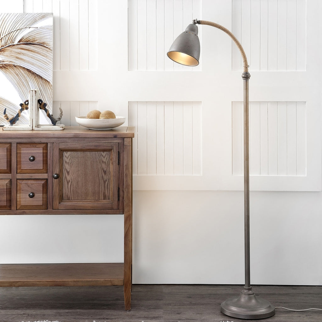SoHo’s latest lounge inspired this industrial chic floor lamp. Complete with rustic rope detail, this modern spin on the traditional pharmacy lamp features metal construction finished in Dark Grey. Ideal by a reading chair in the living room or office.