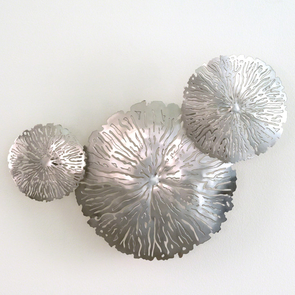 Each highly-detailed, antique brass lily pad leaf is delicately perforated to allow only small amounts of light to pass through. A set of three includes one large, one medium and one small leaf complete with a mounting mechanism for each leaf. Use several clusters to create a multi-dimensional, floral wall. Make Monet proud. Available in Antique Brass and Antique Nickel finishes.