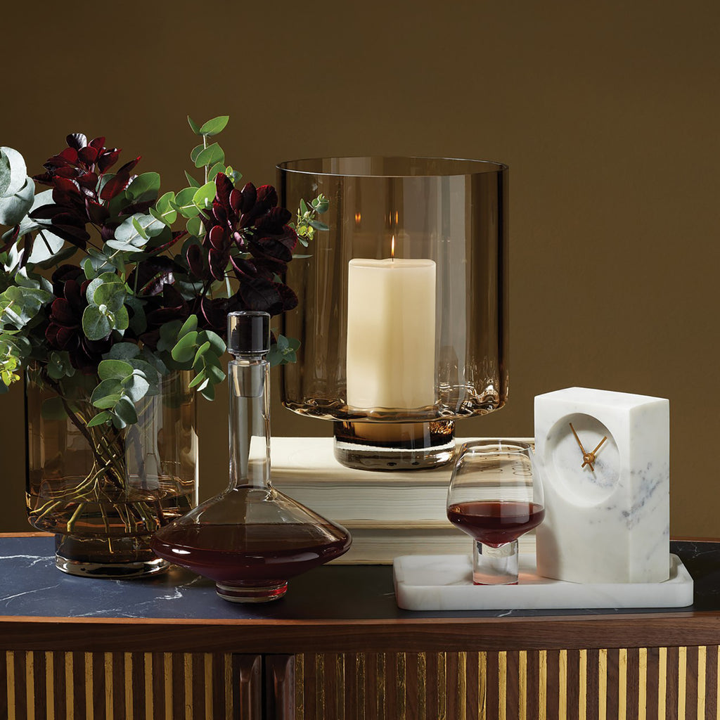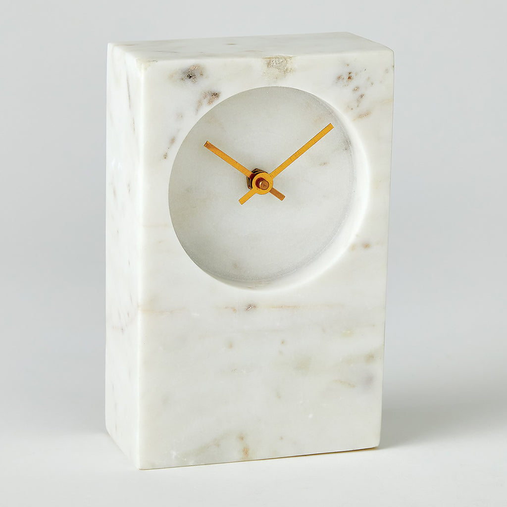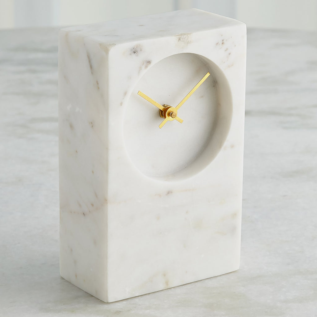The Global Views Marble Tower Clock is crafted from natural marble with simplistic brass clock hands and a brass back plate. Perfect in size, place on any bookshelf, desk or nightstand for style and function. Offered in white, black and green colorways. As marble is a natural product, please be aware that there will be variations in veining and color.
