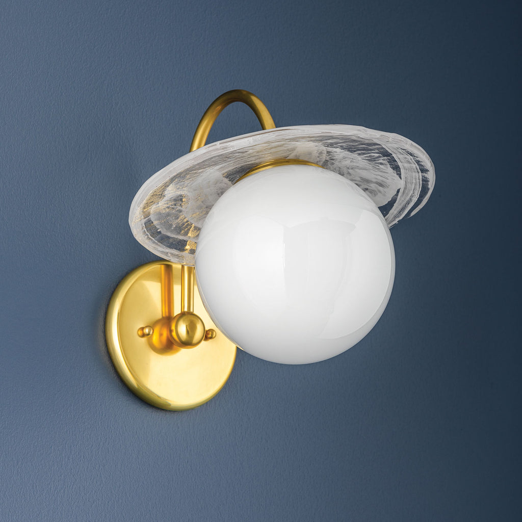 Renowned for built-to-last quality with a timeless feel, Hudson Valley offers a modern lighting collection with elegant touches, recalling vintage inspiration. Rooted in the principles of Art Deco design, Stampford features large opal glossy globes topped with artisanal Piastra glass discs. Both celestial and organic, the striking formation resembles flowers in bloom. The Aged Brass arms enhance the fixture's modern vintage feel, elevating interiors with a warm glow. Available as either a chandelier or wall sconce.