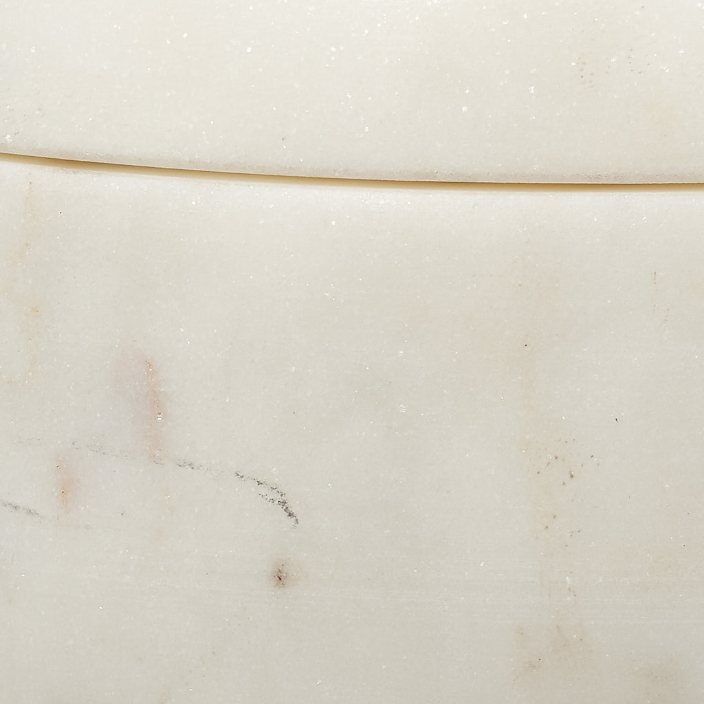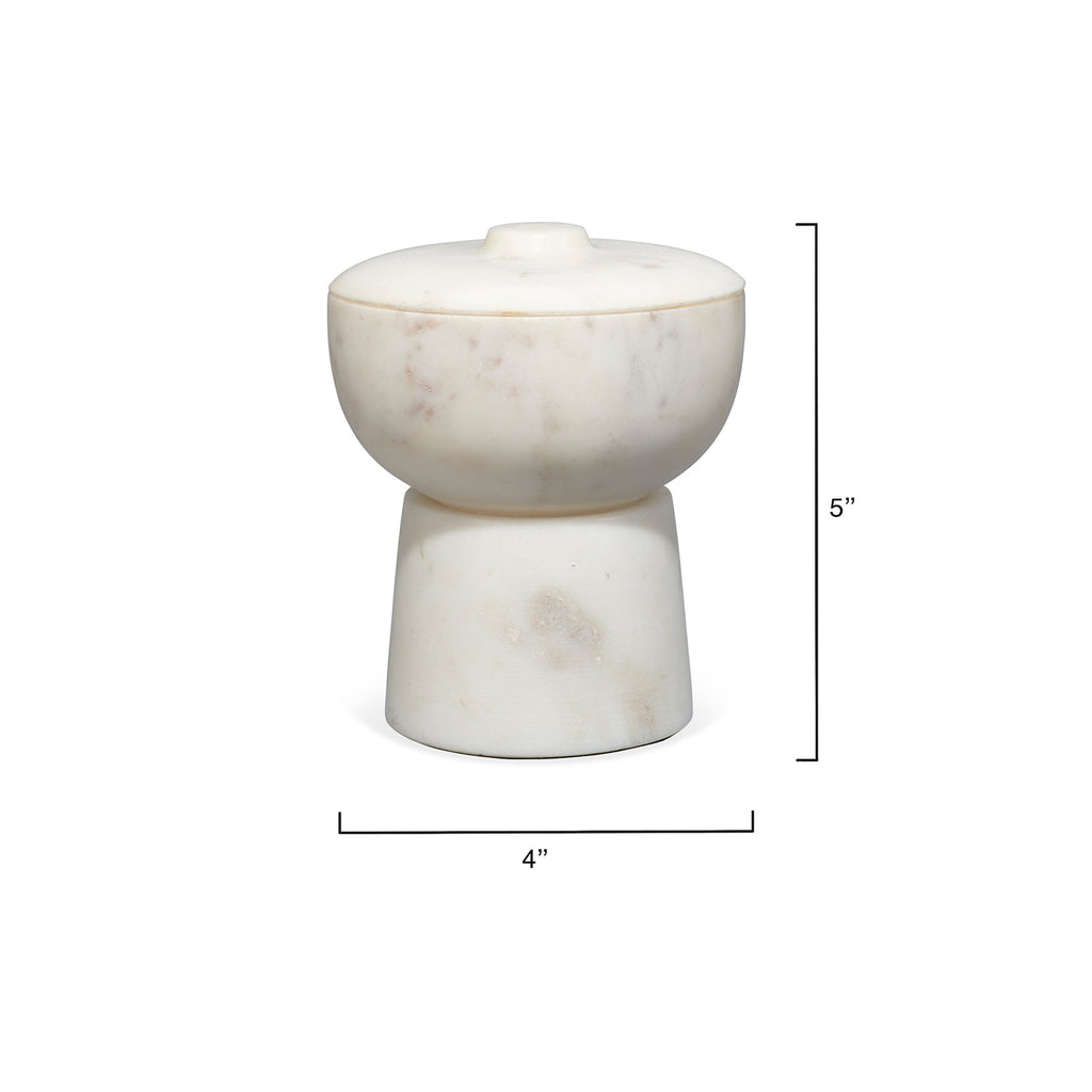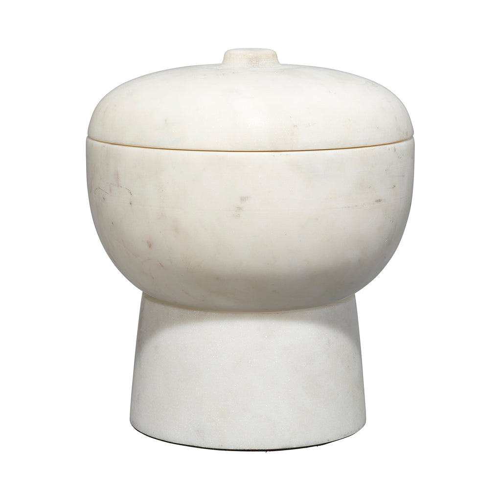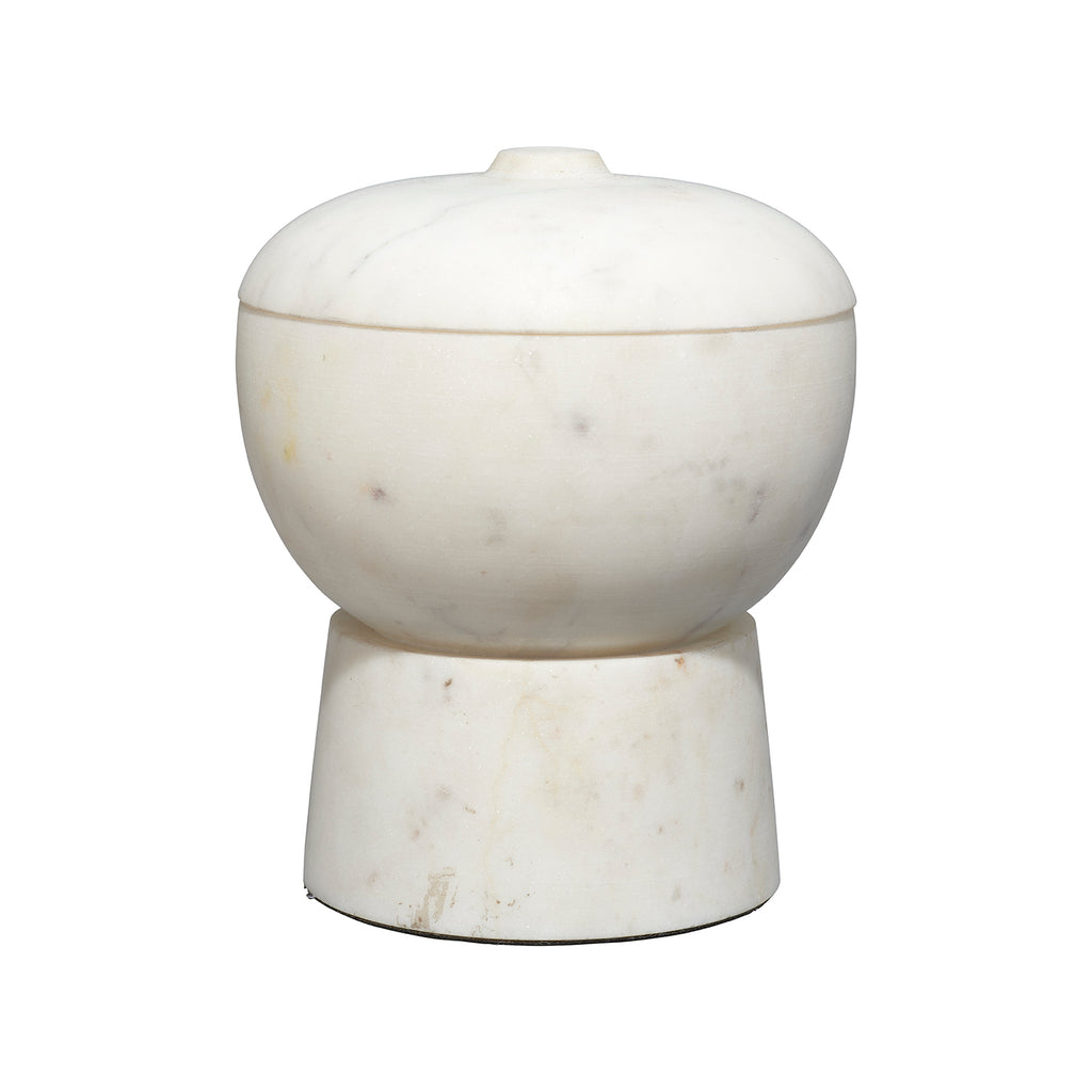 A softly rounded, lidded bowl is placed on top of a pillar base to create some seriously chic storage! These expertly crafted marble containers celebrate the beauty of the natural stone from which they are carved, and no two will be identical. Use with cotton balls in the bath, jewelry in your dressing area, or fill with potpourri to beautify and gently scent your entry. Natural Stone color and markings will vary.