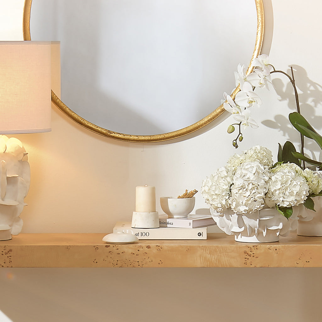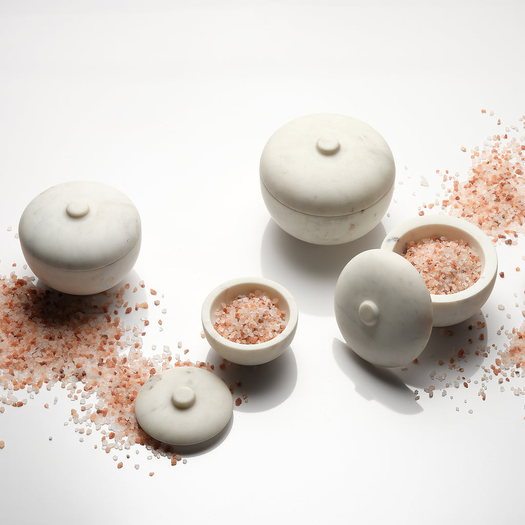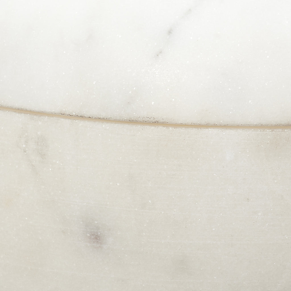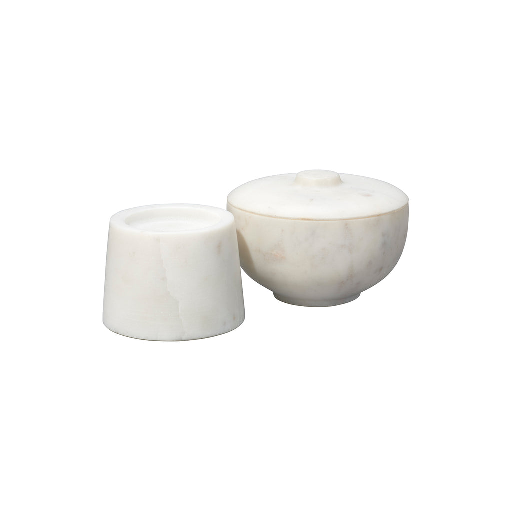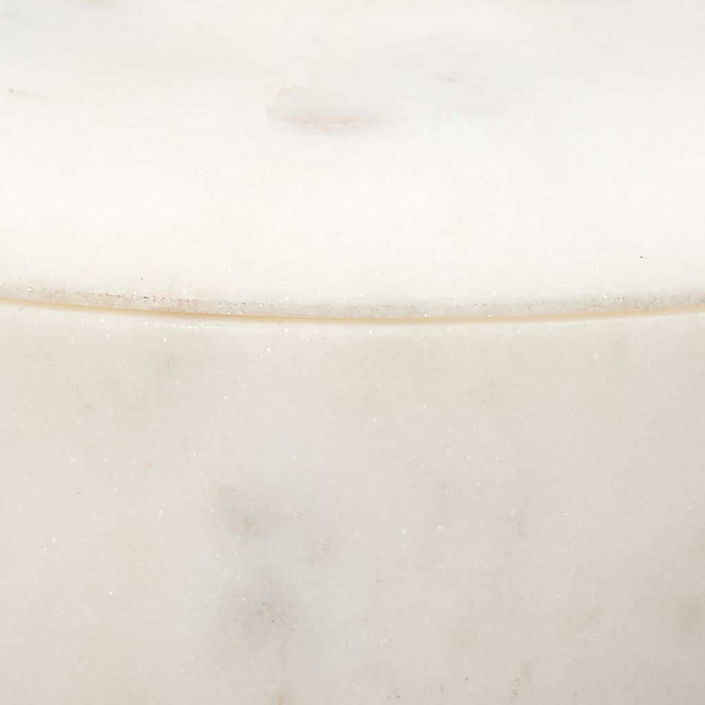 A softly rounded, lidded bowl is placed on top of a pillar base to create some seriously chic storage! These expertly crafted marble containers celebrate the beauty of the natural stone from which they are carved, and no two will be identical. Use with cotton balls in the bath, jewelry in your dressing area, or fill with potpourri to beautify and gently scent your entry. Natural Stone color and markings will vary.
