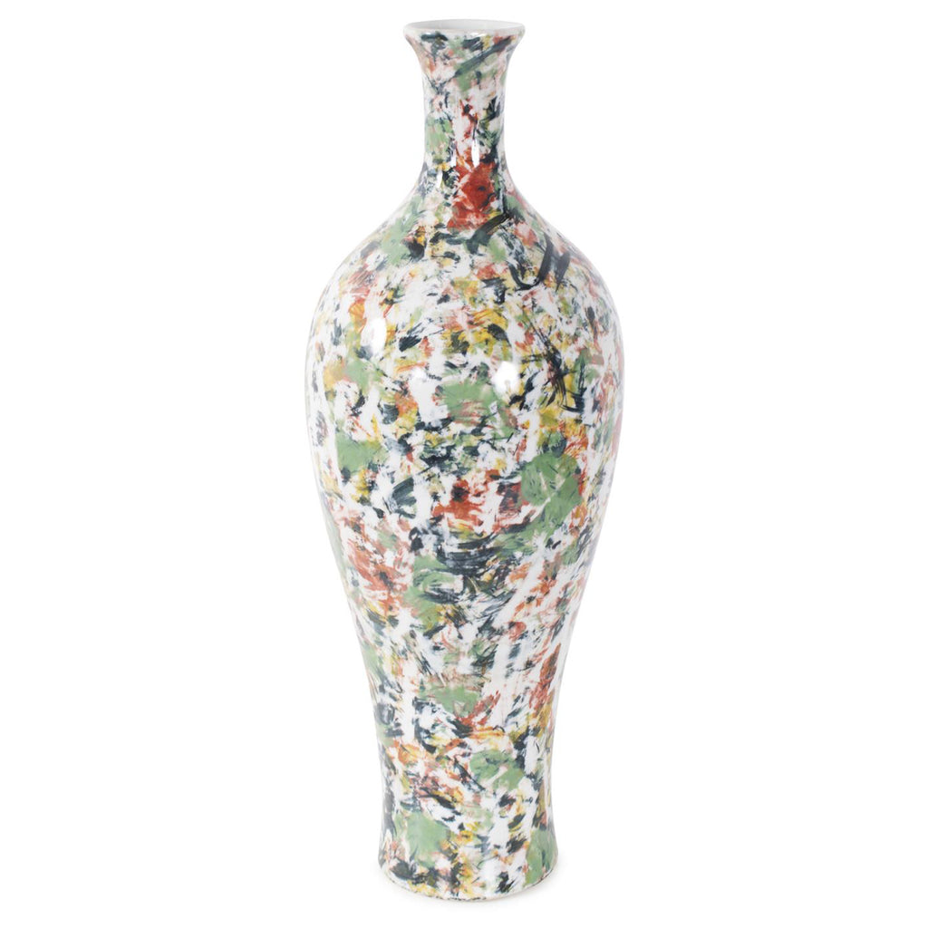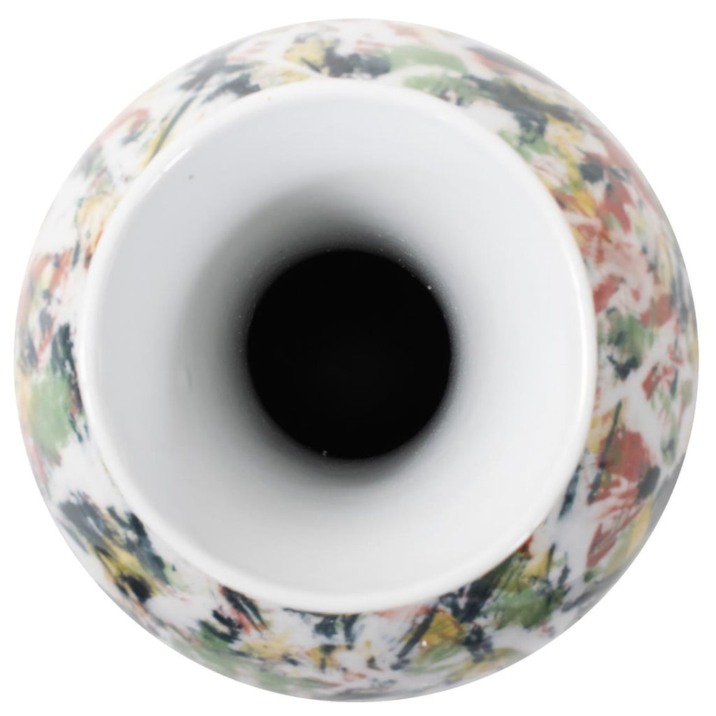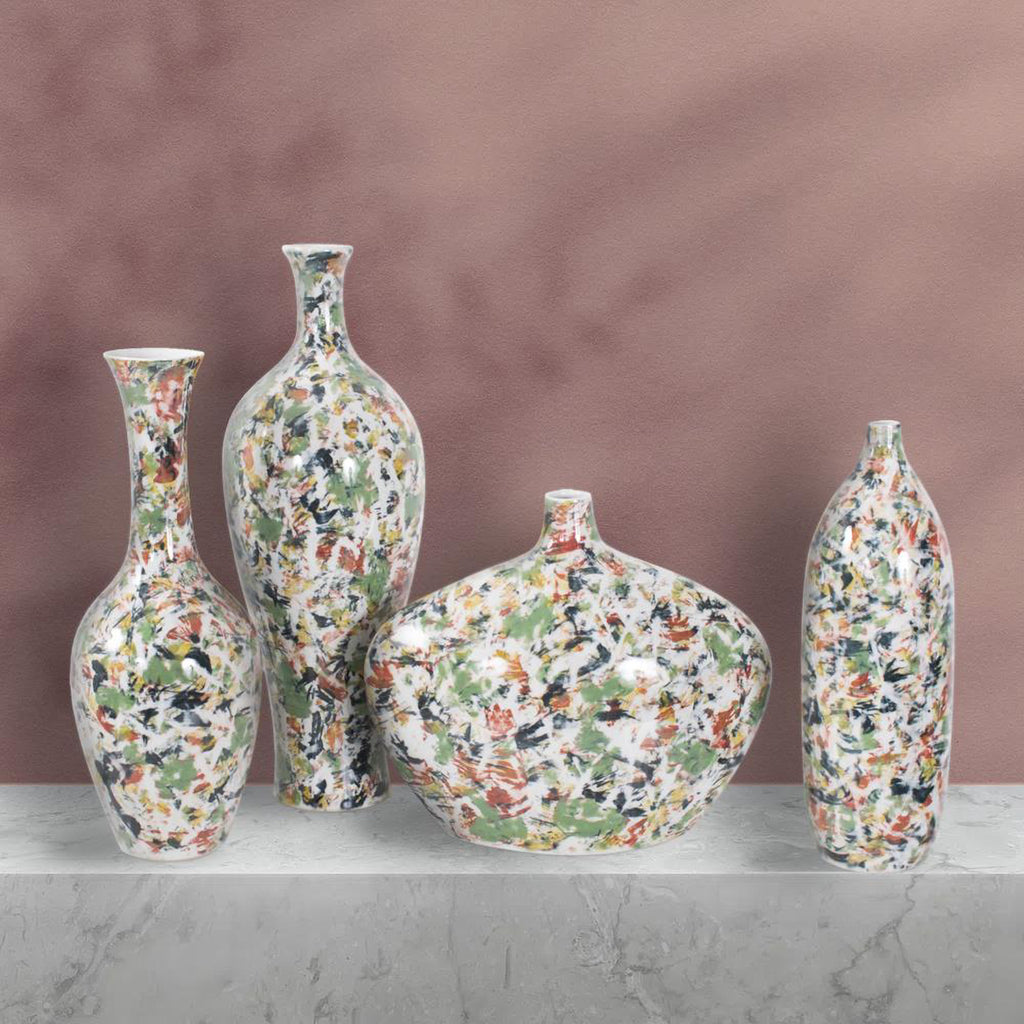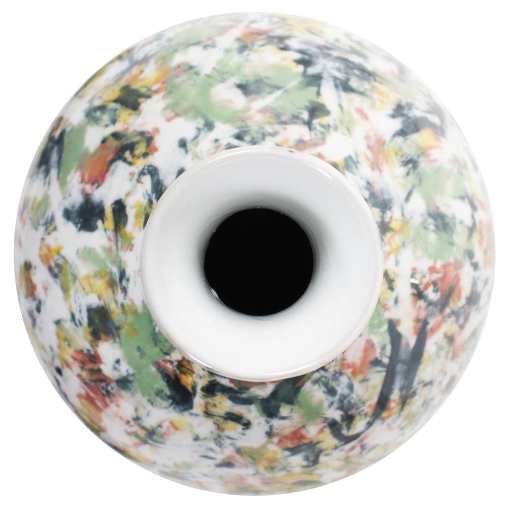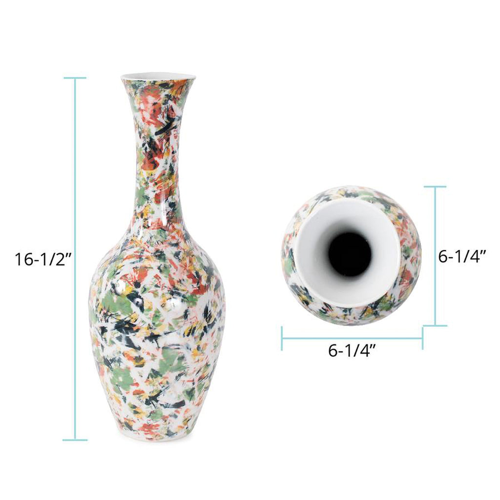 Elevate your home decor with this exquisite white vase, each adorned with sporadic bursts of color in refreshing shades of green, orange, blue, and yellow, resembling delicate paint brush strokes. Handcrafted with meticulous attention to detail, this vase is a testament to the skill and precision of our artisans. The smooth, pristine surface serves as the canvas for the spontaneous bursts of vibrant color, creating a mesmerizing visual contrast that will captivate anyone who beholds it.