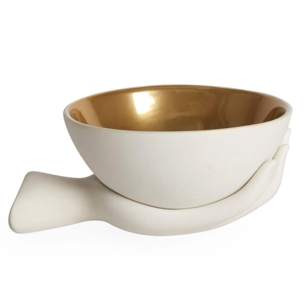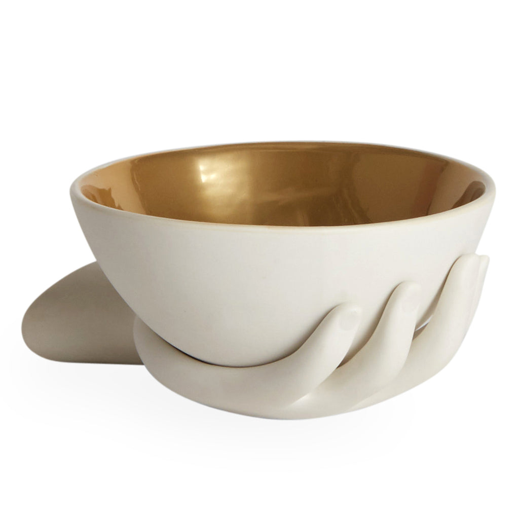 A hand-sculpted homage to surprise and seduction, the Jonathan Adler Eve Accent Bowl is a fitting spot for flaunting your favorite temptations. Inspired by Eve and made from high-fired matte porcelain with a glimmering gold interior. The Muse Collection substitutes our signature geometric relief patterns with body parts- faces, breasts, lips -to create a surreal style. Each piece is inspired by our favorite artists' muses.