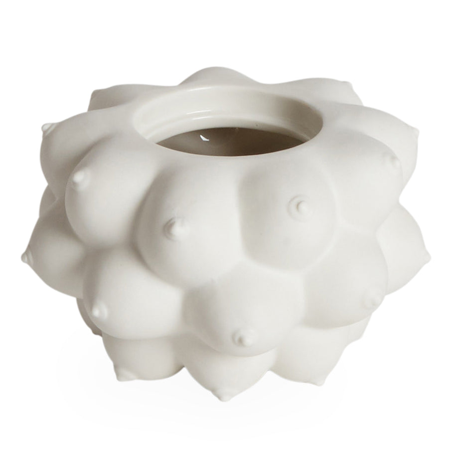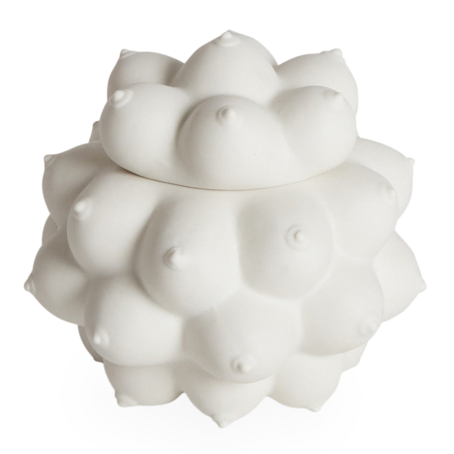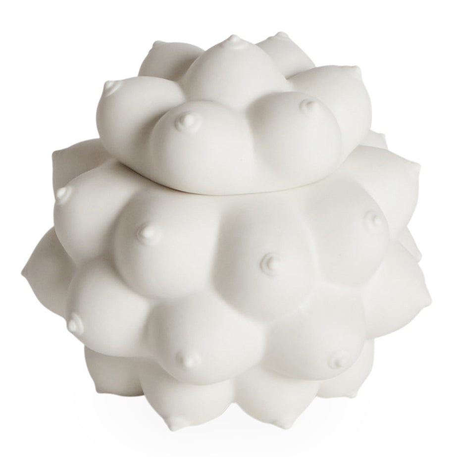 An artful cluster of idealized form topped with a removable lid. Stash your secrets in a chic celebration of provocation. Inspired by American artist Georgia O'Keeffe. Jonathan Adler throws the models for the Muse vessels and then substitutes our signature geometric relief patterns with body parts- faces, breasts, lips -to create a surreal style. Each piece is made from unglazed matte porcelain to accentuate the forms and is inspired by our favorite artists' muses.