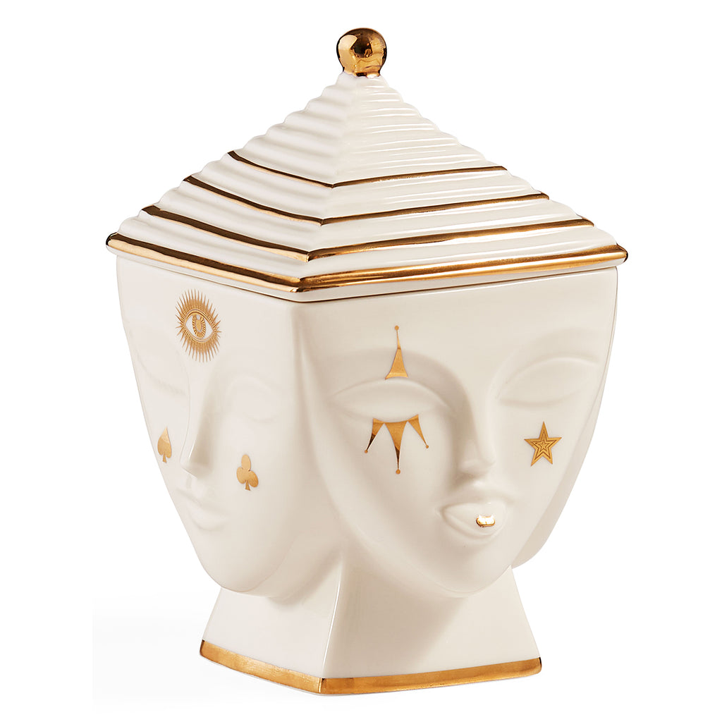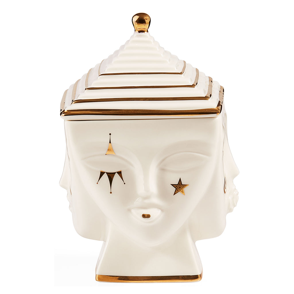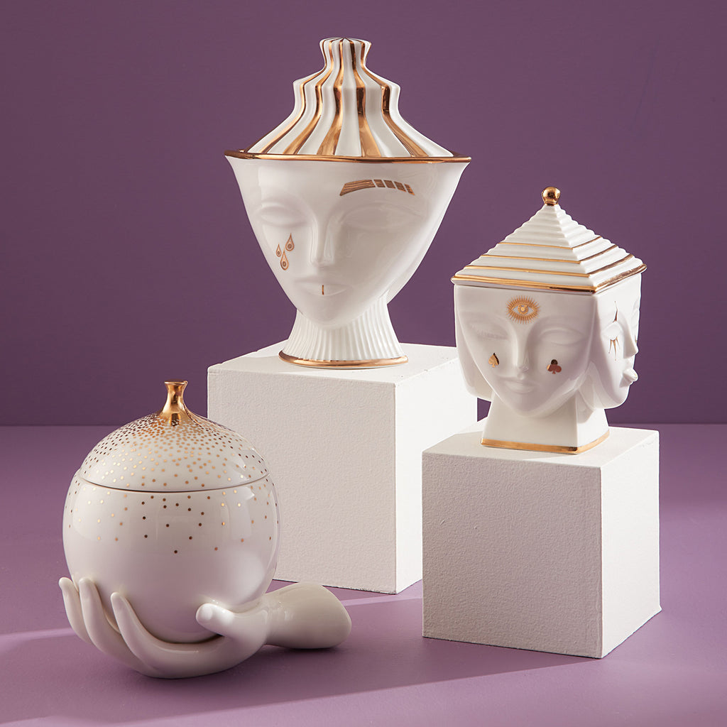 The Jonathan Adler Masquerade must topped with a Deco-inspired lid. Featuring four unique faces, each de-faced with subversive signs and symbols rendered in glittering gold. A surreal spot for stashing secrets. Jonathan sculpts and throws the models for our Muse pottery and then substitutes our signature geometric relief patterns with body parts—faces, breasts, lips—to create a surreal style. Pieces are inspired by our favorite artists' muses.