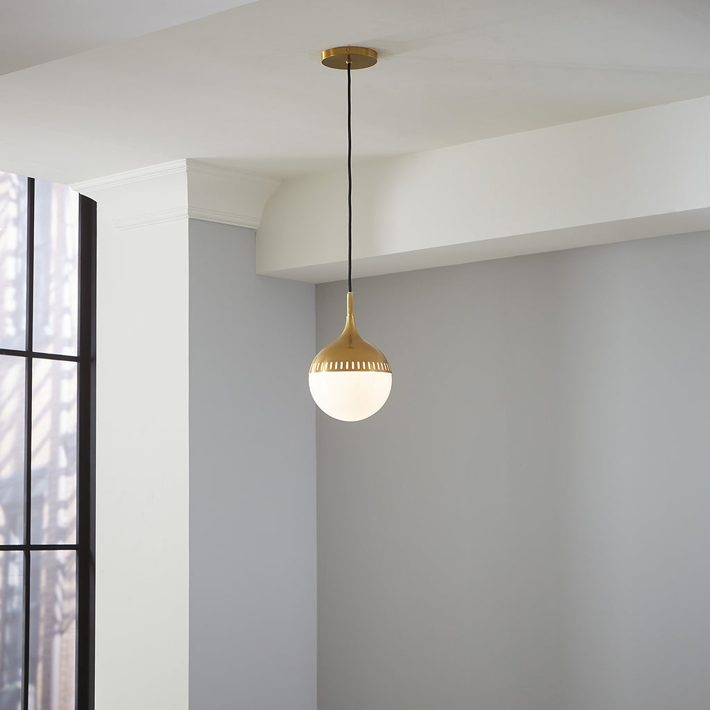 Conjure mid-century modernism with a light that swings between industrial cool and vintage warmth. Laser-cut detailing accentuates the orb's elongated silhouette. Cluster three Rio Small Pendant Lights at different heights above a tailored sofa or generously sized cocktail table.