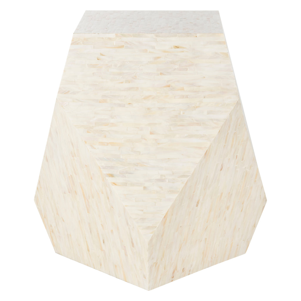 Bold and beautiful, this contemporary mosaic geometric side table instantly transforms any living room. Designed with lacquered faux mother-of-pearl, its soft beige tones illuminate its dynamic sculptural form to create a chic, functional focal point.