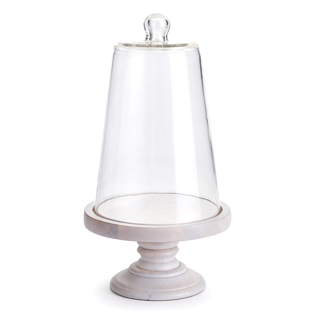 Classic in design with a whitewashed turned wood base, this cloche is light and lovely. A beautiful way to display natural elements, flameless candles or ornaments.