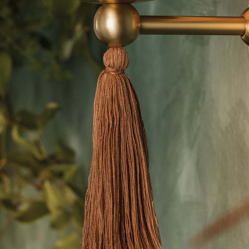 Inspired by spindle legs on antique wooden furniture, the Aged Brass frame of the Mitzi Niya family is slender with decorative sphere details. The bowl-shaped shades are blown from milky cloud glass, emitting an ambient glow when lit. Pulling from traditional Chinese lanterns, each candle stem is adorned with Mandy Cheng’s signature tassel detail rendered in cotton linen string.