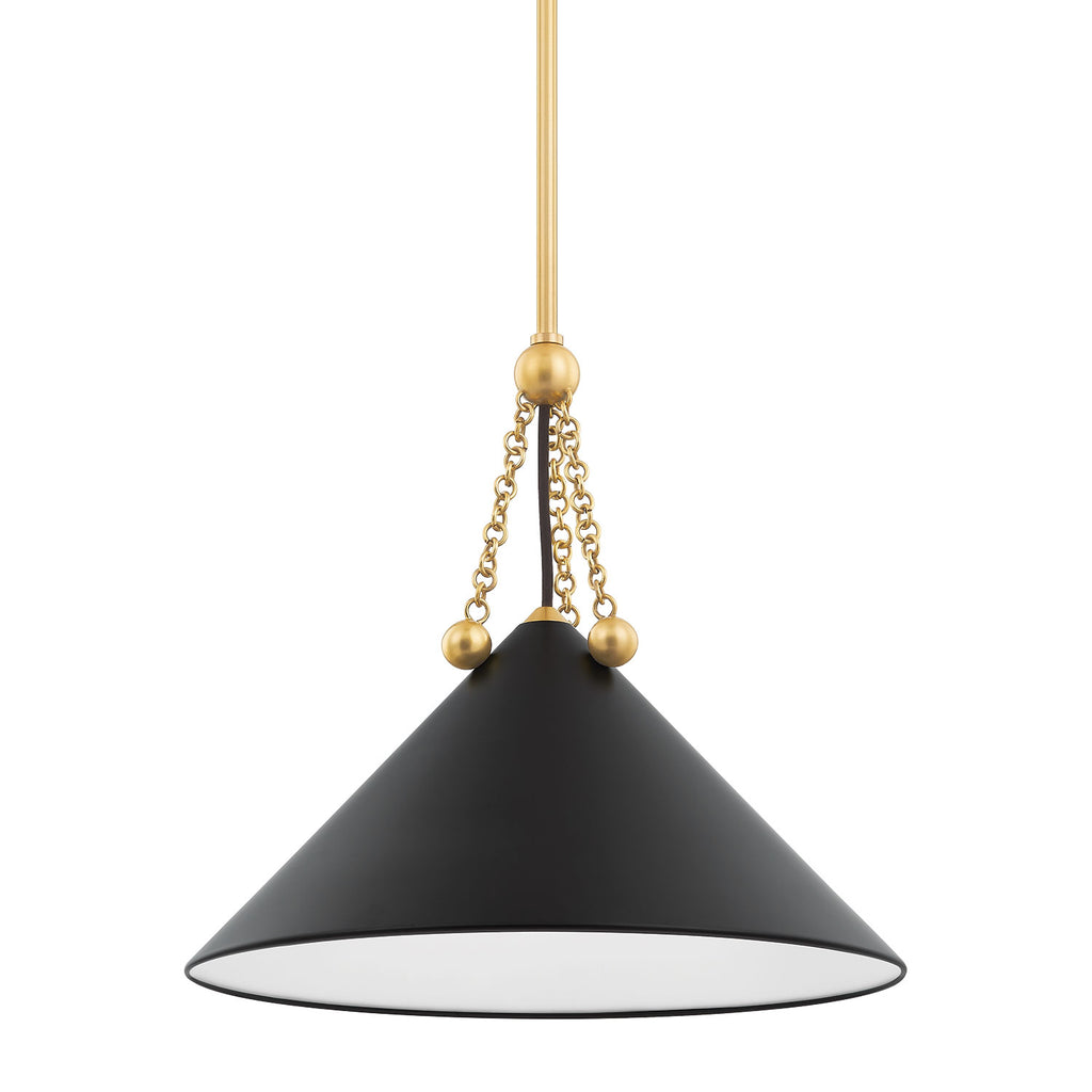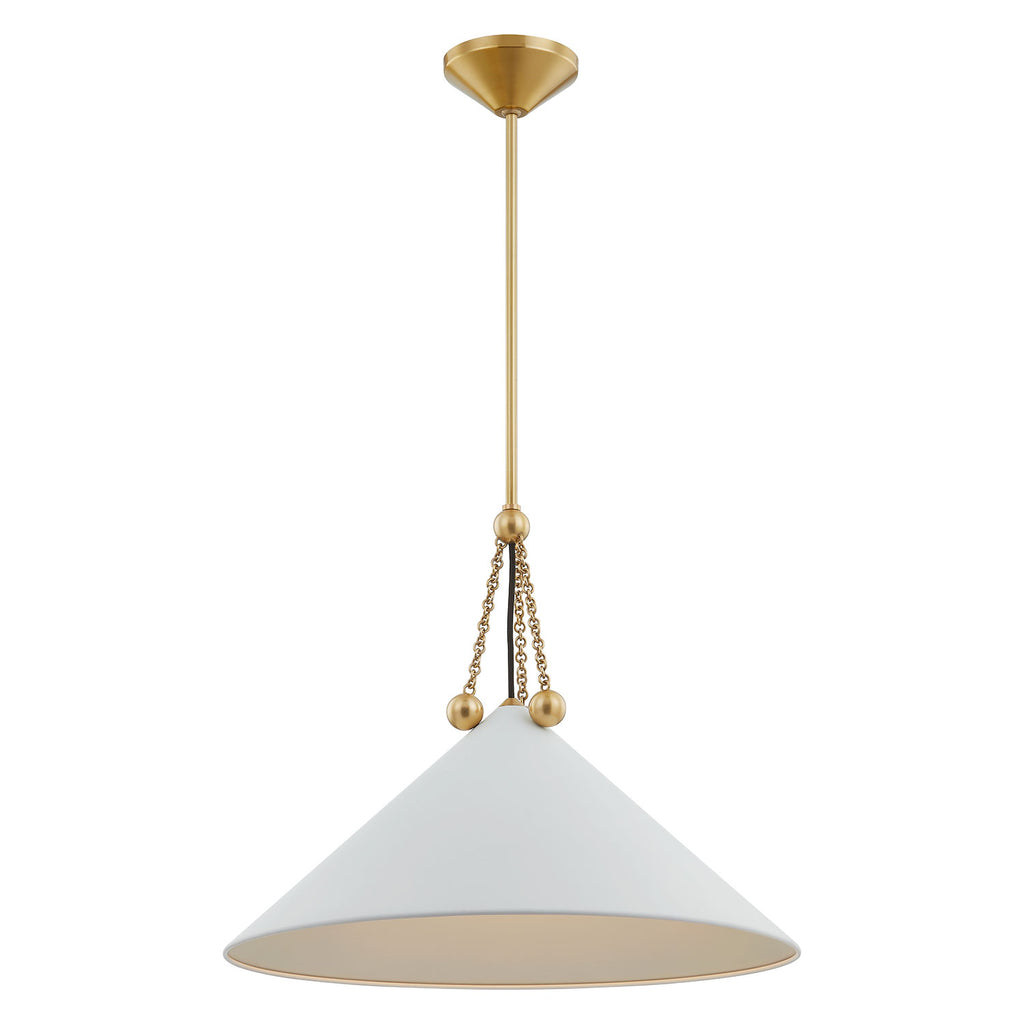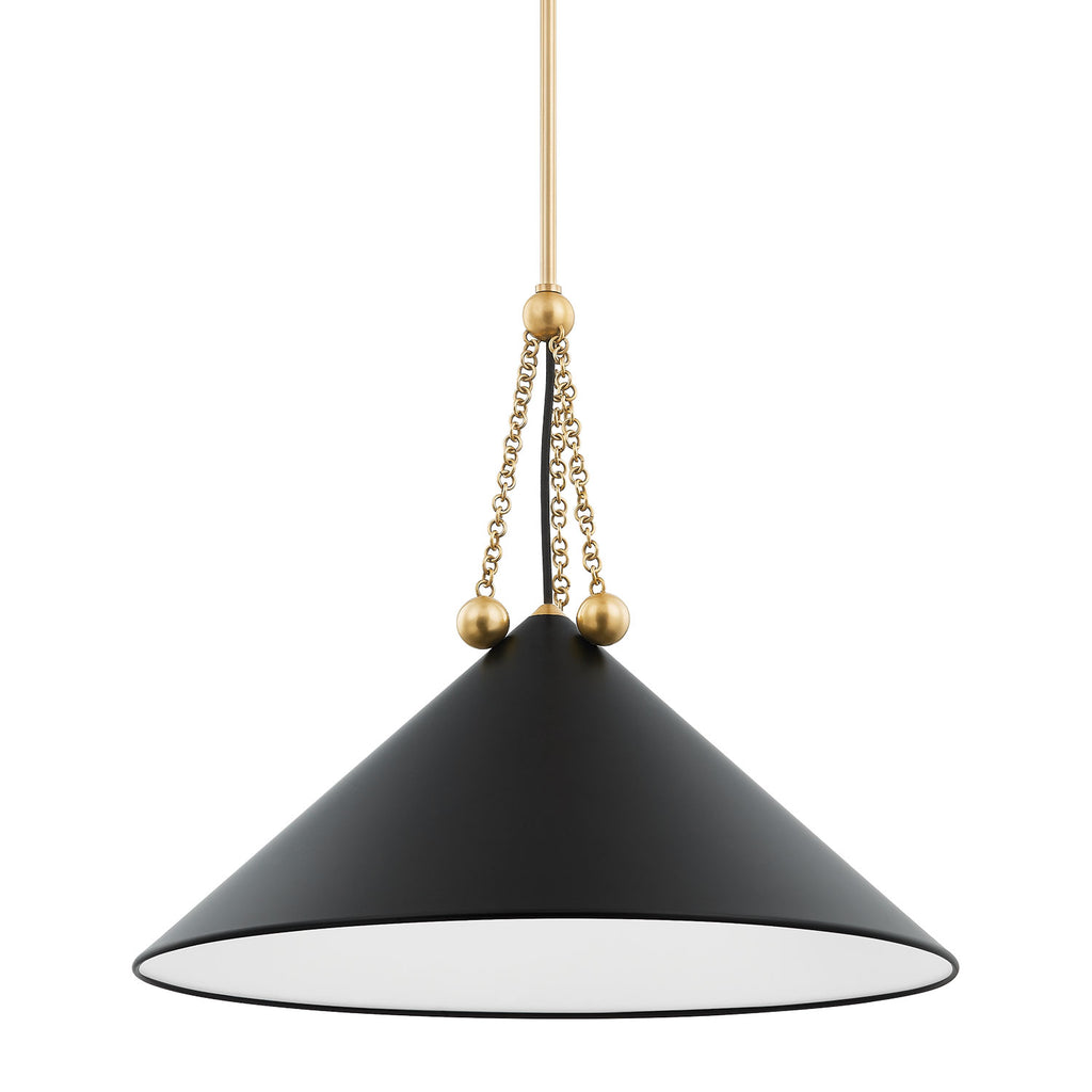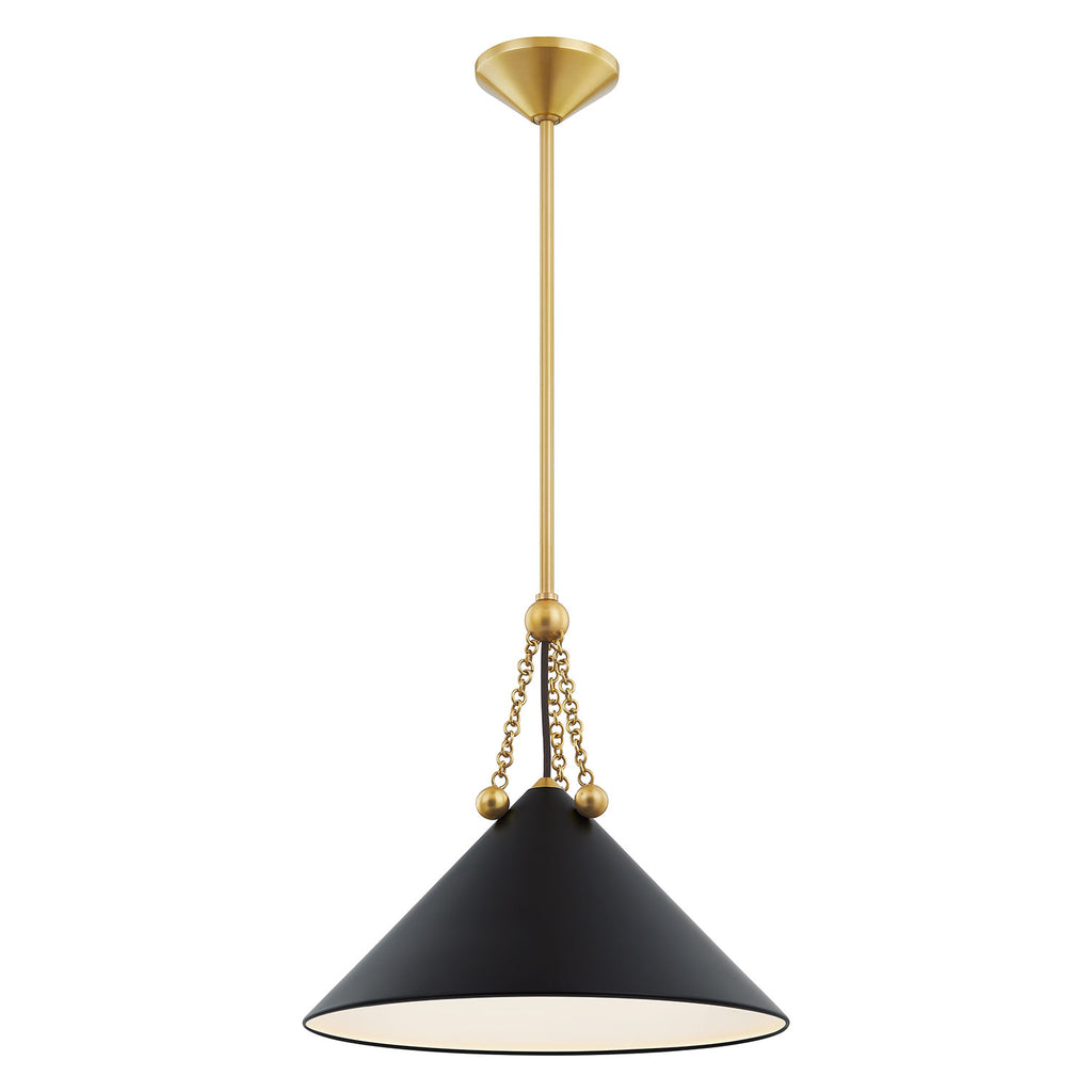 High-quality and exceedingly creative, Mitzi delivers a semi-nostalgic classic lighting collection with streamlined contemporary elements that instantly upgrade your space. Suspended from the ceiling, pendant lighting by Mitzi offers extra light expression exactly where you need it with a functional high-design feel. Boho meets Bauhaus in this ornamental and architectural pendant. The detailed Aged Brass chainwork, orb accents, and metal tip at the top decorate the straightforward, angular shade with jewelry-like accents. The all-over Soft White finish feels crisp and clean, while the Soft Black shade has a Soft White interior for a more dramatic effect.