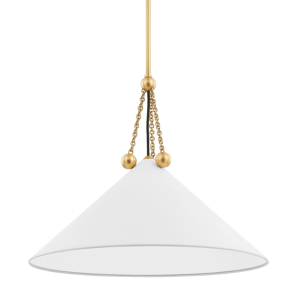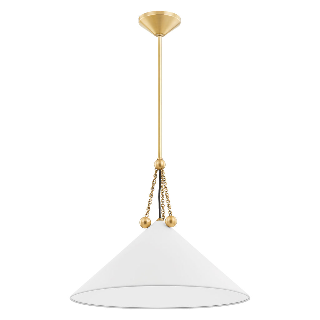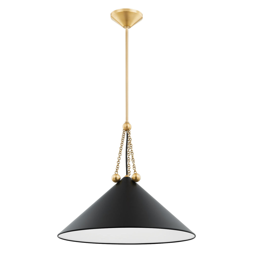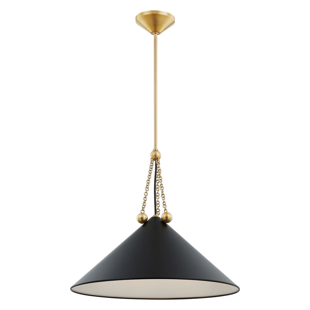 High-quality and exceedingly creative, Mitzi delivers a semi-nostalgic classic lighting collection with streamlined contemporary elements that instantly upgrade your space. Suspended from the ceiling, pendant lighting by Mitzi offers extra light expression exactly where you need it with a functional high-design feel. Boho meets Bauhaus in this ornamental and architectural pendant. The detailed Aged Brass chainwork, orb accents, and metal tip at the top decorate the straightforward, angular shade with jewelry-like accents. The all-over Soft White finish feels crisp and clean, while the Soft Black shade has a Soft White interior for a more dramatic effect.