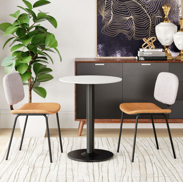 A stylish and hardworking cafe table for all of your spaces: kitchen, living room, office, or bar area. A disc floats on a pedestal that appears to emerge from the ground.