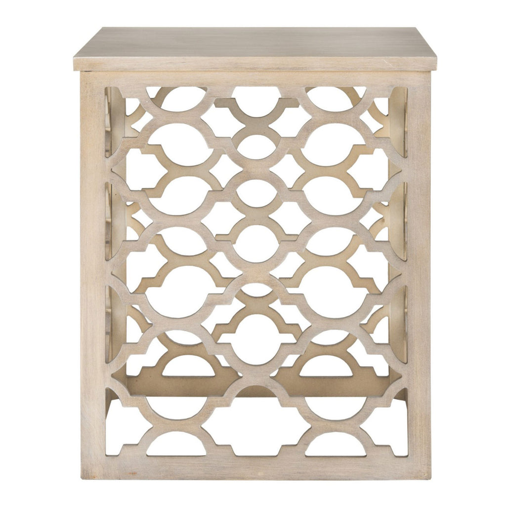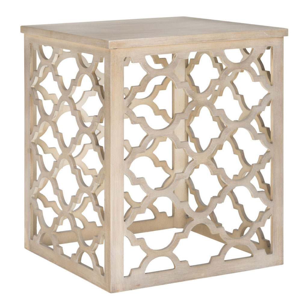 Inspired by a Moroccan iron architectural fragment, the distressed white grille effect of the Lonny end table brings an open and airy feel to transitional rooms. The strong rectangular shape of this piece contrasts the curved ogee double arch motif.