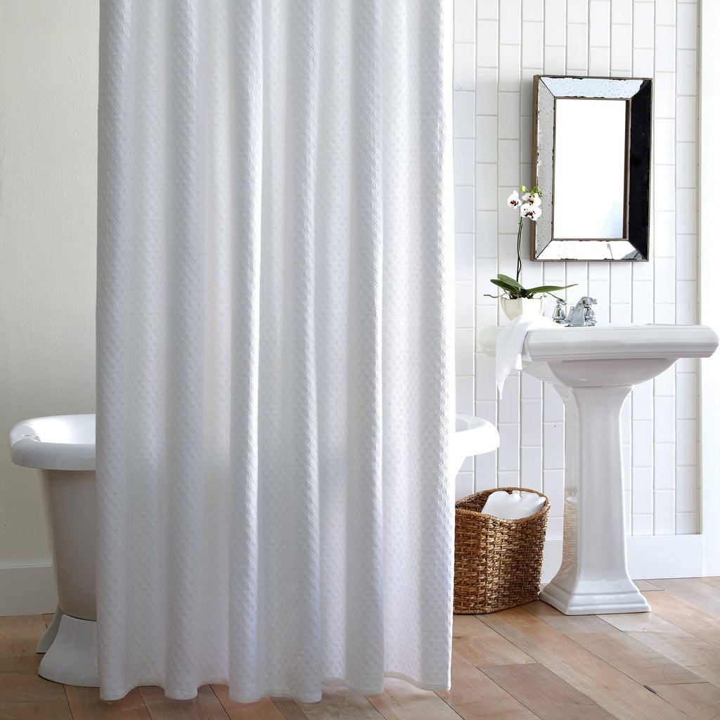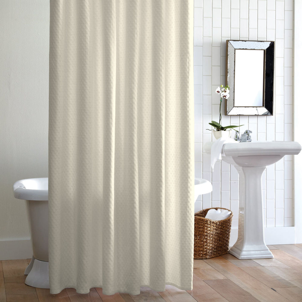 Alyssa matelasse shower curtain from Peacock Alley features a diamond design and a single decorative hem stitching.