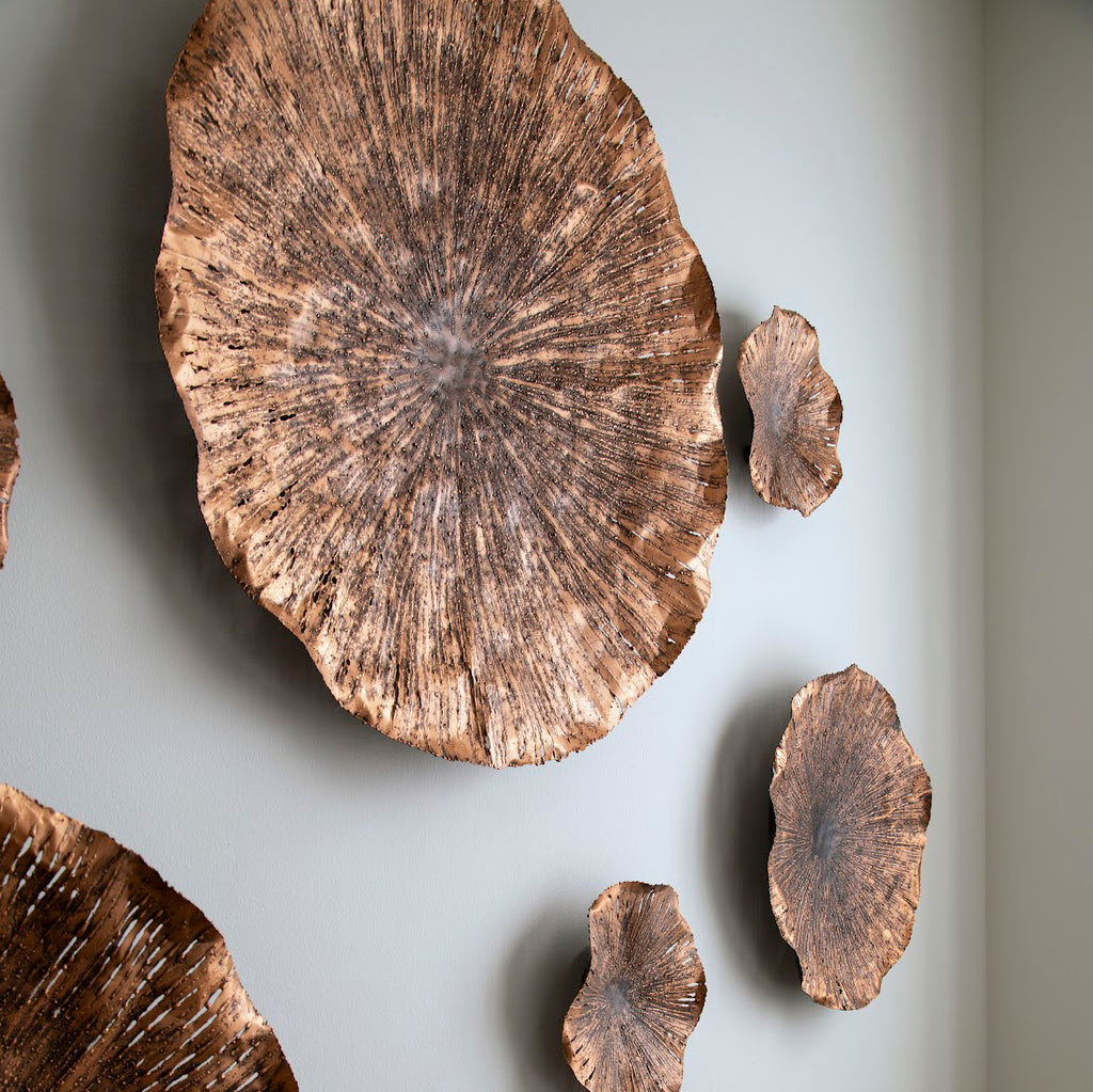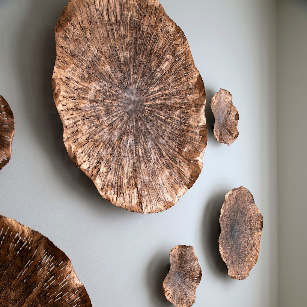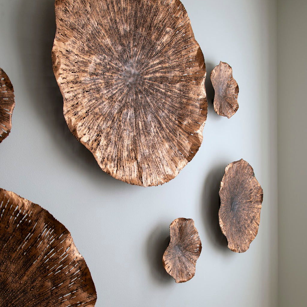 One of the most sacred symbols in some cultures is the lotus leaf. It’s also one of the most beautiful natural elements in the world. We’ve captured that beauty with our Lotus Large Copper Wall Art, which is hand-cut from metal sheets in mix of copper and black finishes. The surfaces of these decorative sculptures with sheen and the darker veining, which brings the sculptures subtle texture, is black.