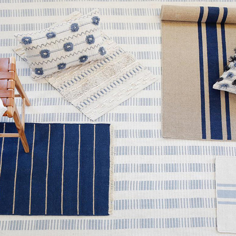 The Pom Pom at Home handwoven Izzy features blue pom poms with knit stripes and zig zags.