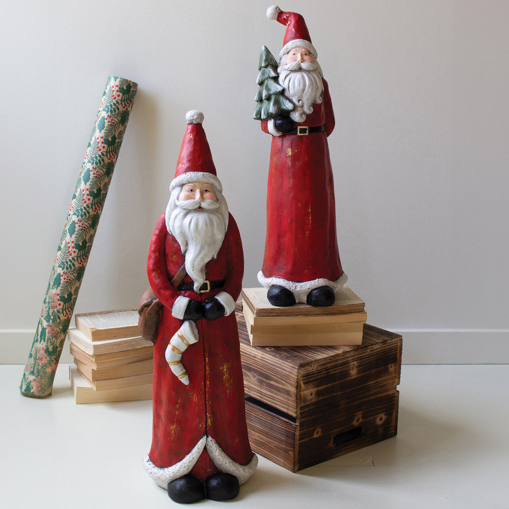 This set of two resin Santas suits any decor style. One holds a tree the other a Christmas stocking. Separate these Kris Kringles or group them with your other jolly elves.