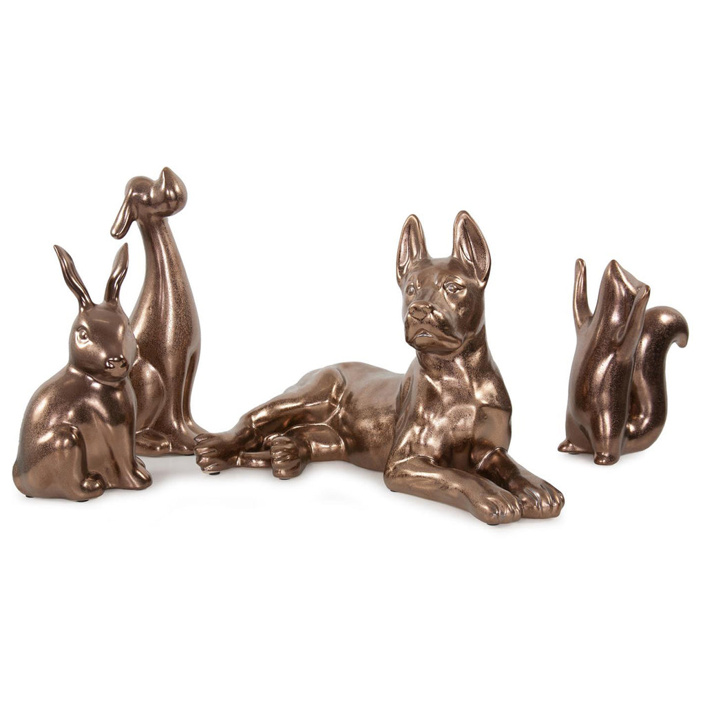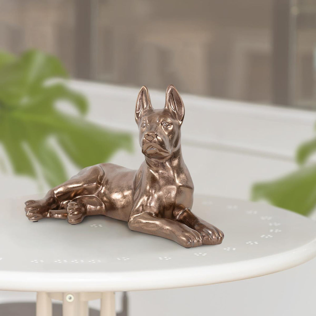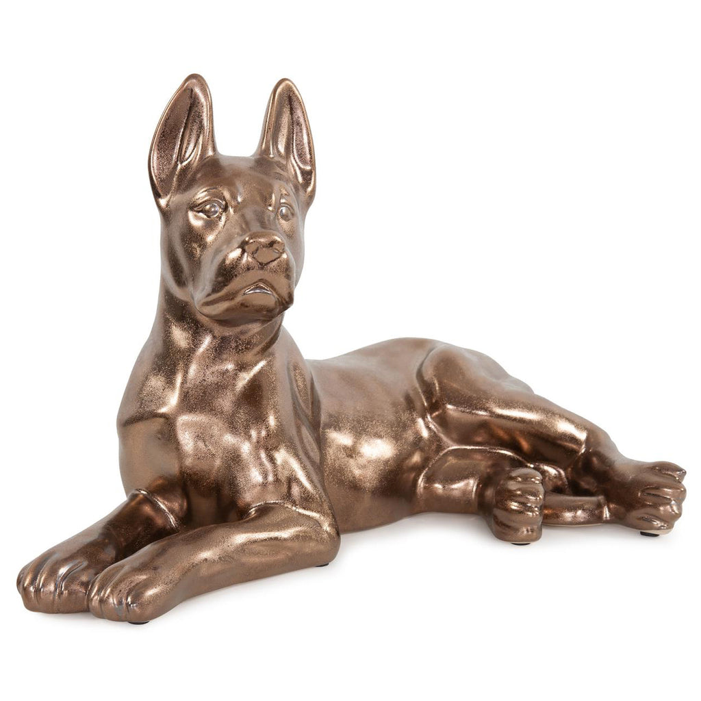 In a comfortable laying down position, Sammy the ceramic Shepard never lets down his guard protecting us from what dangers may lie ahead. He is showing off his new finish in the deep rich antique brass color tones. Lifestyle trends are increasingly looking to the antique finishes in metallics such as brass to add a touch of warmth and old world flair to your home environment