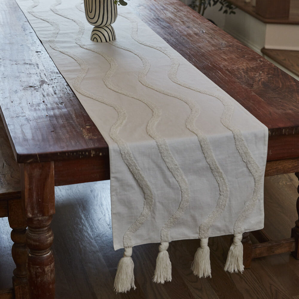 An easy, elegant way to freshen up the room, the versatile Solna Table Runner brings trendy design & neutral color to the table. This 108-inch runner features a cotton fabric background with textured, embroidered squiggles down the length, ending in matching cotton tassels. Tonal color creates a neutral base that coordinates with a variety of place settings & serving piece styles. This piece should be dry cleaned.