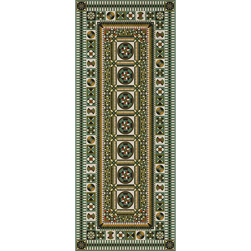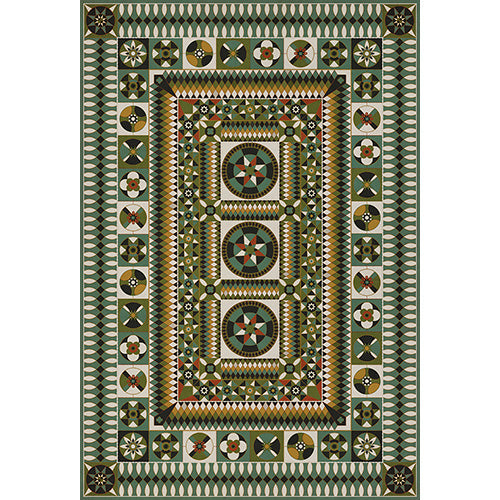 The Field of Battle vinyl floor cloth from the Folk Art Museum Soldiers Quilt collection was inspired by vintage linoleum. Perfect for kitchens, baths, screened in porches and patios, the durable vinyl floorcloths are easy to clean and always lay flat. Vinyl floorcloths are made with two-ply vinyl with latex padded backing, designed to be fade-resistant in direct sunlight and durable against the elements but work best in controlled outdoor environments.