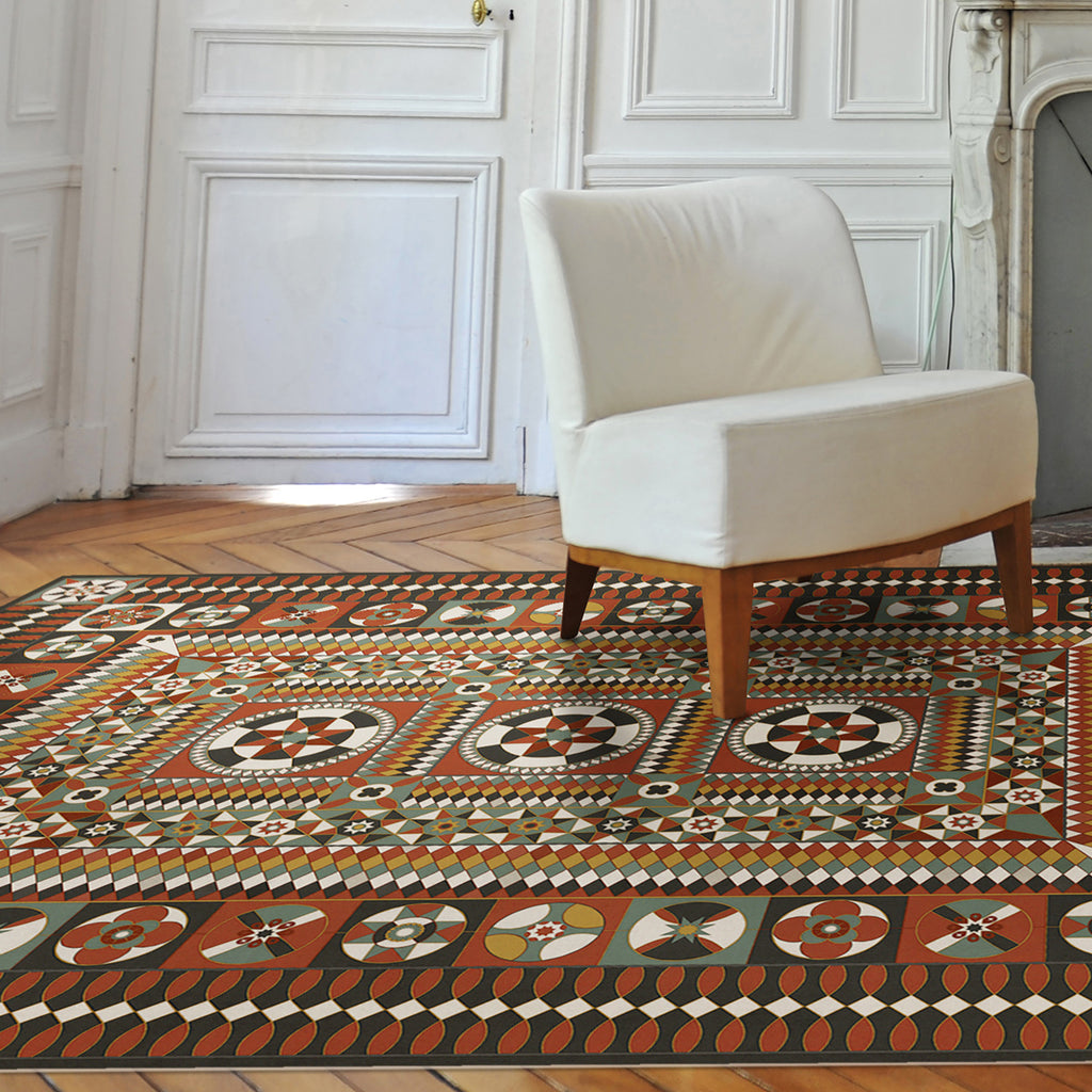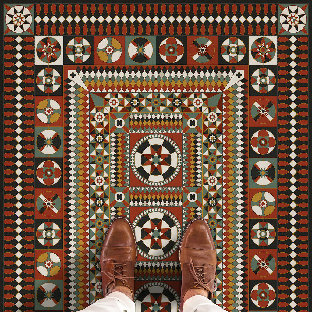 The Uniform Relics vinyl floor cloth from the Folk Art Museum Soldiers Quilt collection was inspired by vintage linoleum. Perfect for kitchens, baths, screened in porches and patios, the durable vinyl floorcloths are easy to clean and always lay flat. Vinyl floorcloths are made with two-ply vinyl with latex padded backing, designed to be fade-resistant in direct sunlight and durable against the elements but work best in controlled outdoor environments.