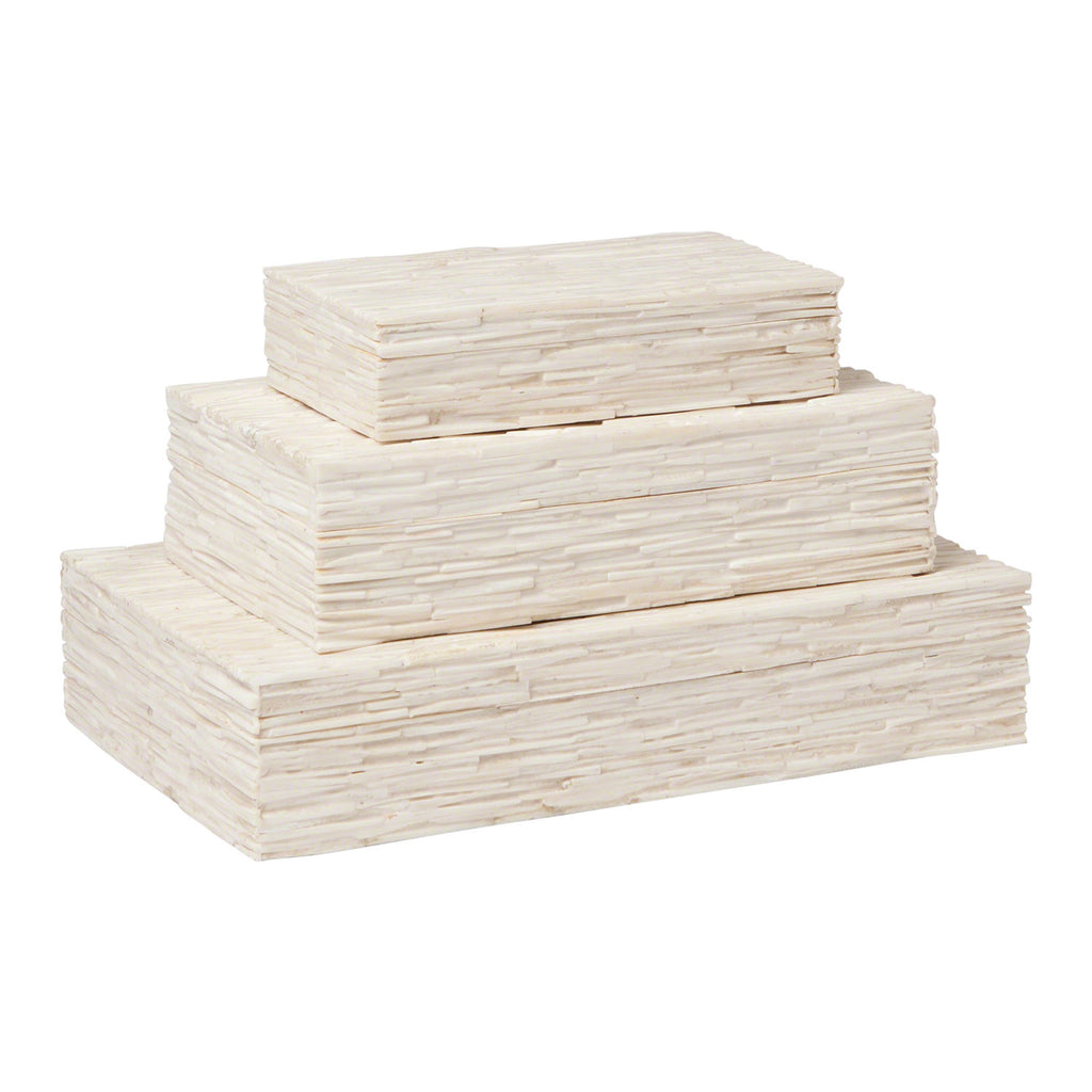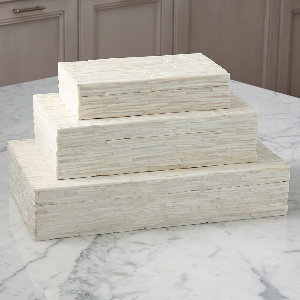 The Studio A Chiseled Bone box is a hand-hewn chiseled bone boxes with detachable lids are intricately crafted to reflect the beauty of natural bone. Finished wooden interiors. Available in three sizes.
