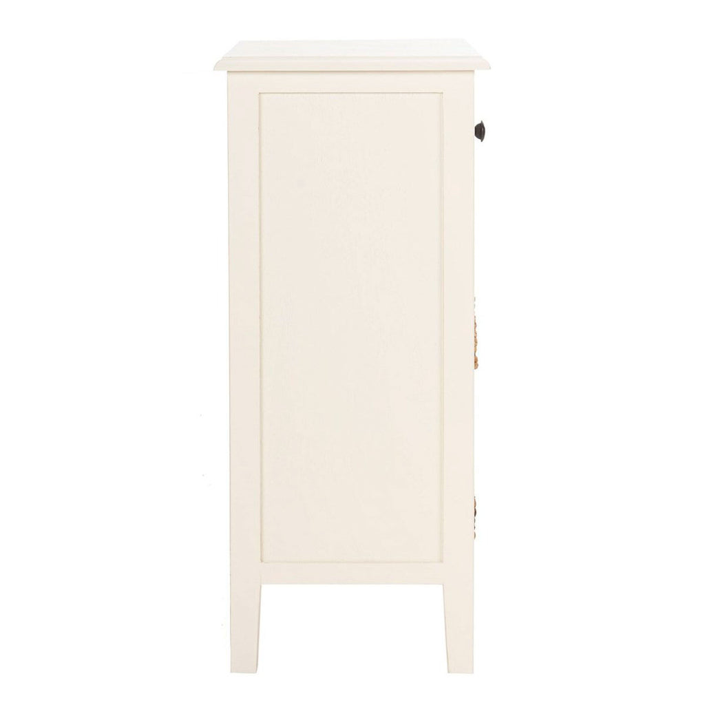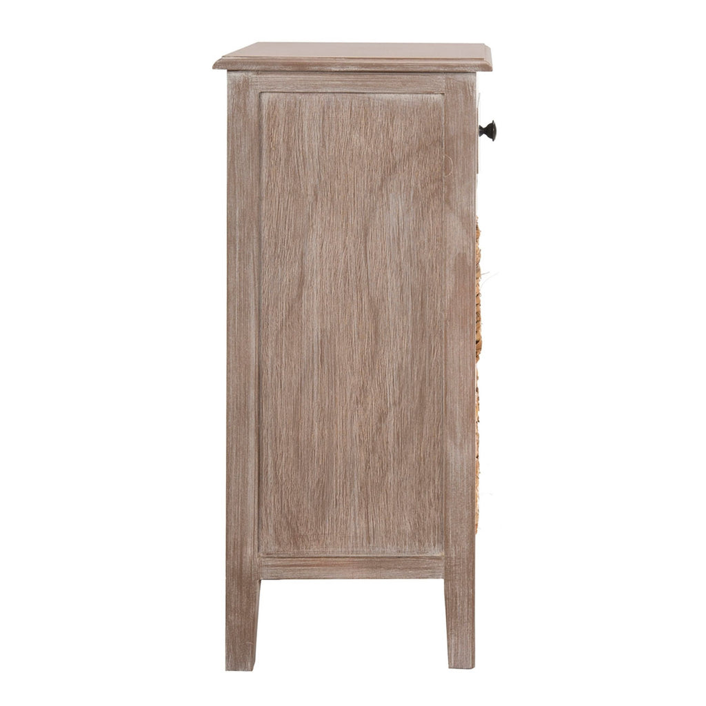 A neat little side table with top drawer and two removable woven rattan baskets with cutout handles, this distressed black piece is brimming with storage space. Crafted of pine in distressed black finish, it makes finding what you need easier than ever.