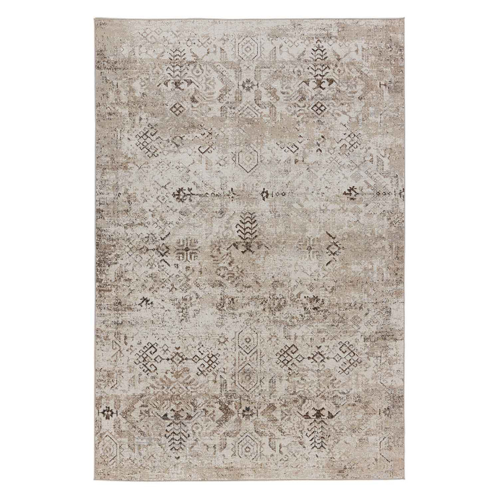 The incredibly chic Nadine collection offers durability and easy-care without compromising one bit on the style. This kid and pet-friendly assortment of rugs features a washable quality and a range of globally inspired designs that anchor rooms with eye-catching appeal. The Kati rug showcases a distressed tribal pattern in brown on a cream, gray, tan, and deep brown striated background. The 100% polyester fibers provide a slight sheen and lasting quality that thrives in high traffic areas of the home such as kitchens, halls, bathrooms, living rooms, and bedrooms.