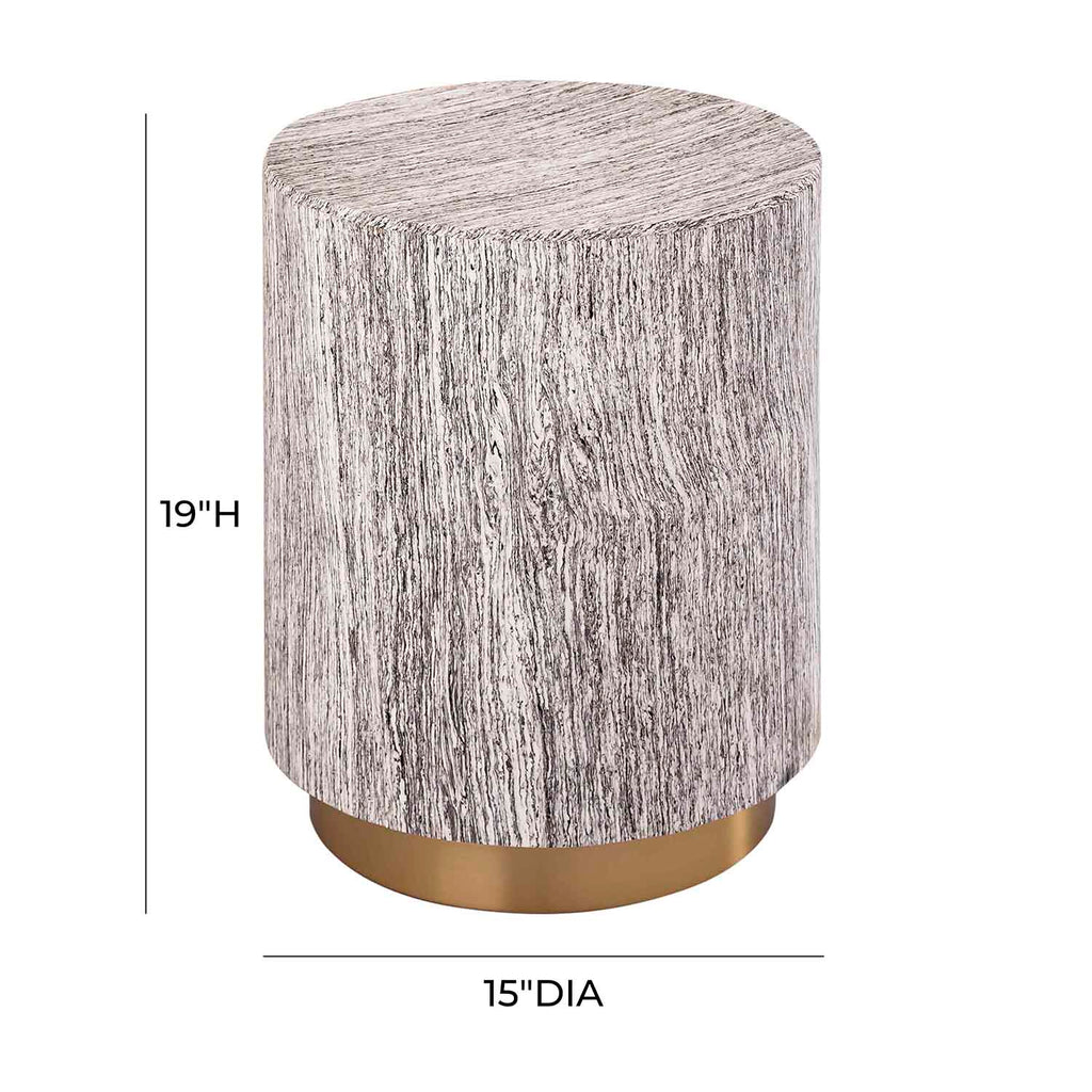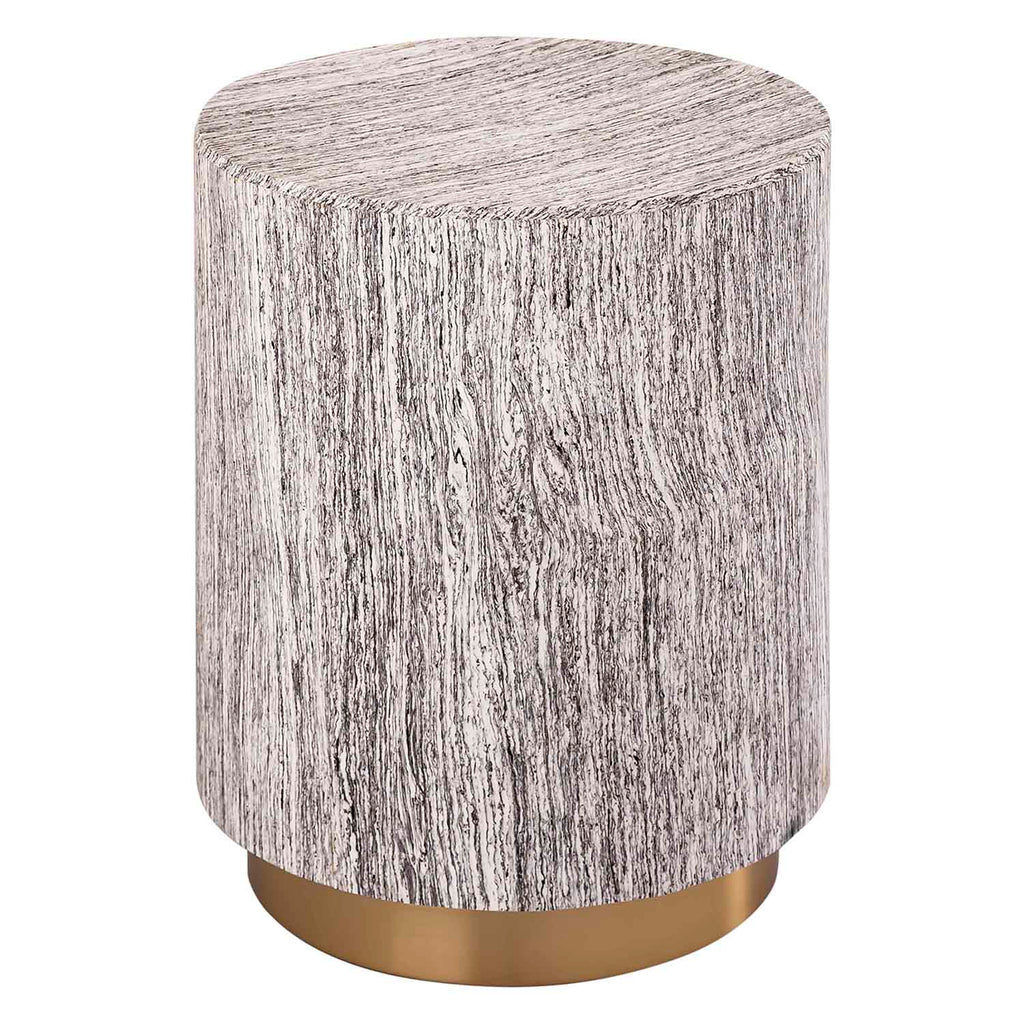 Inspired by petrified logs and singular designs, the Zobiya table is a warm and homey accent piece. This table features a cylindrical body supported by a gold base, and neutral tones perfect for any setting.