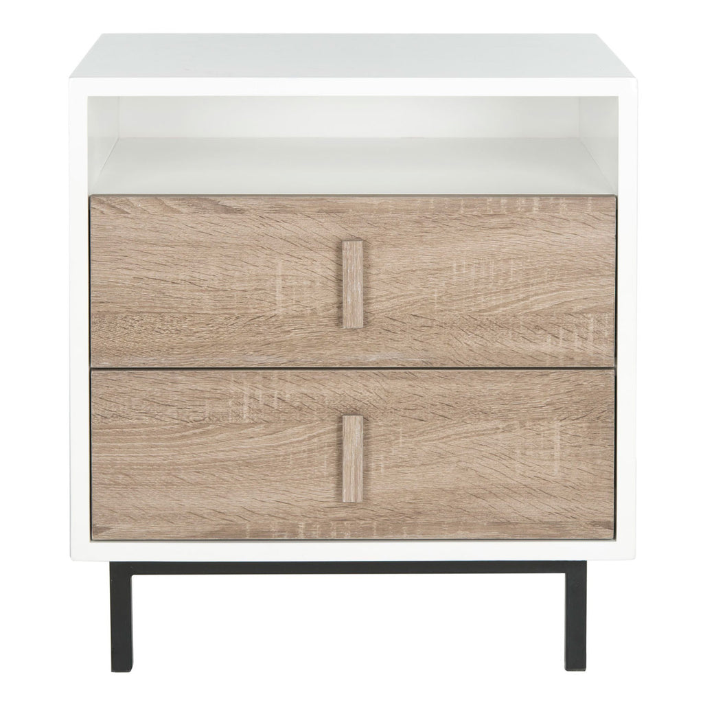 Contemporary with a nod to retro Danish modern style, this cabinet in white and oak-grained MDF is as good looking and practical as a bedside table as it is beside a living room sofa. Two drawers and open shelf provide plenty of storage.