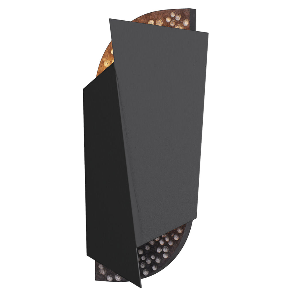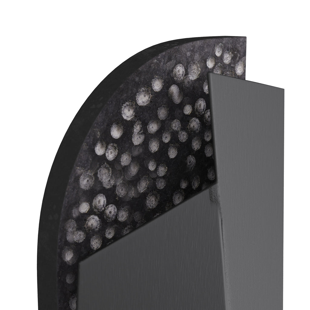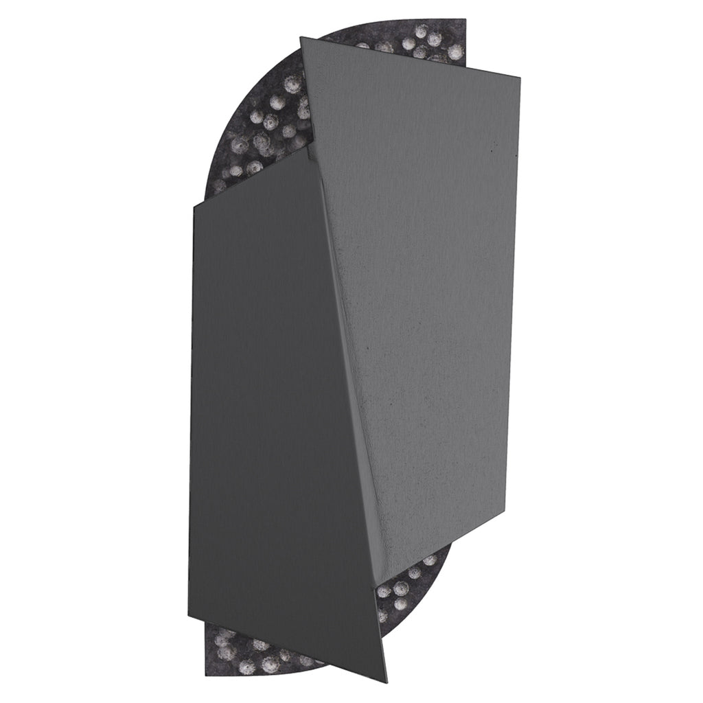 Playful intersecting planes of waxed blackened iron and black chiseled marble make an eye-catching mix in this modern sconce. Making the most of its intriguing lattice surface, it is designed so that light will reflect off the chiseled marble surface, delivering a soft and moody glow to any space. Damp-rated, although limited covered outdoor conditions may affect finish. Finish will vary.