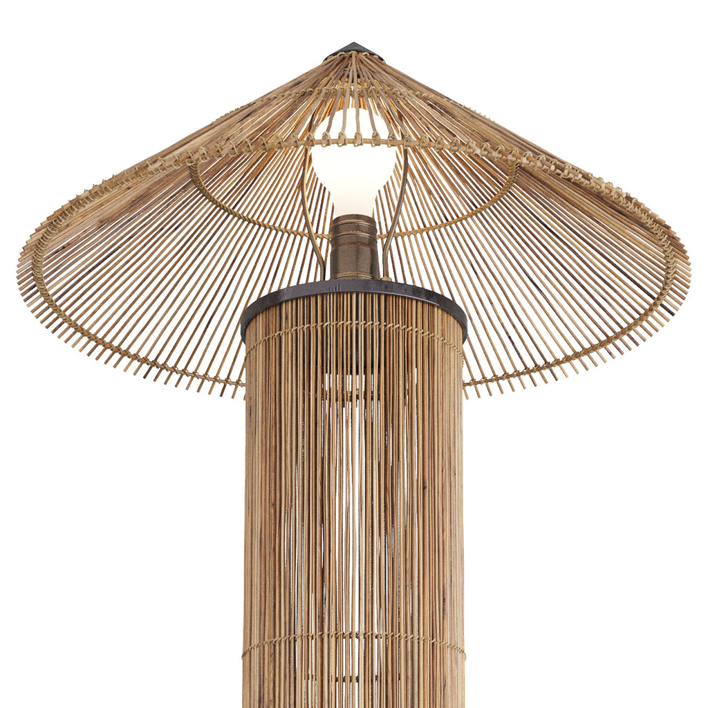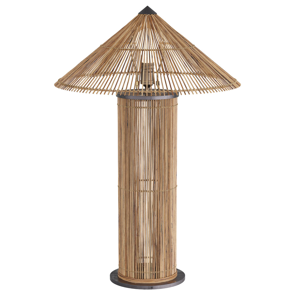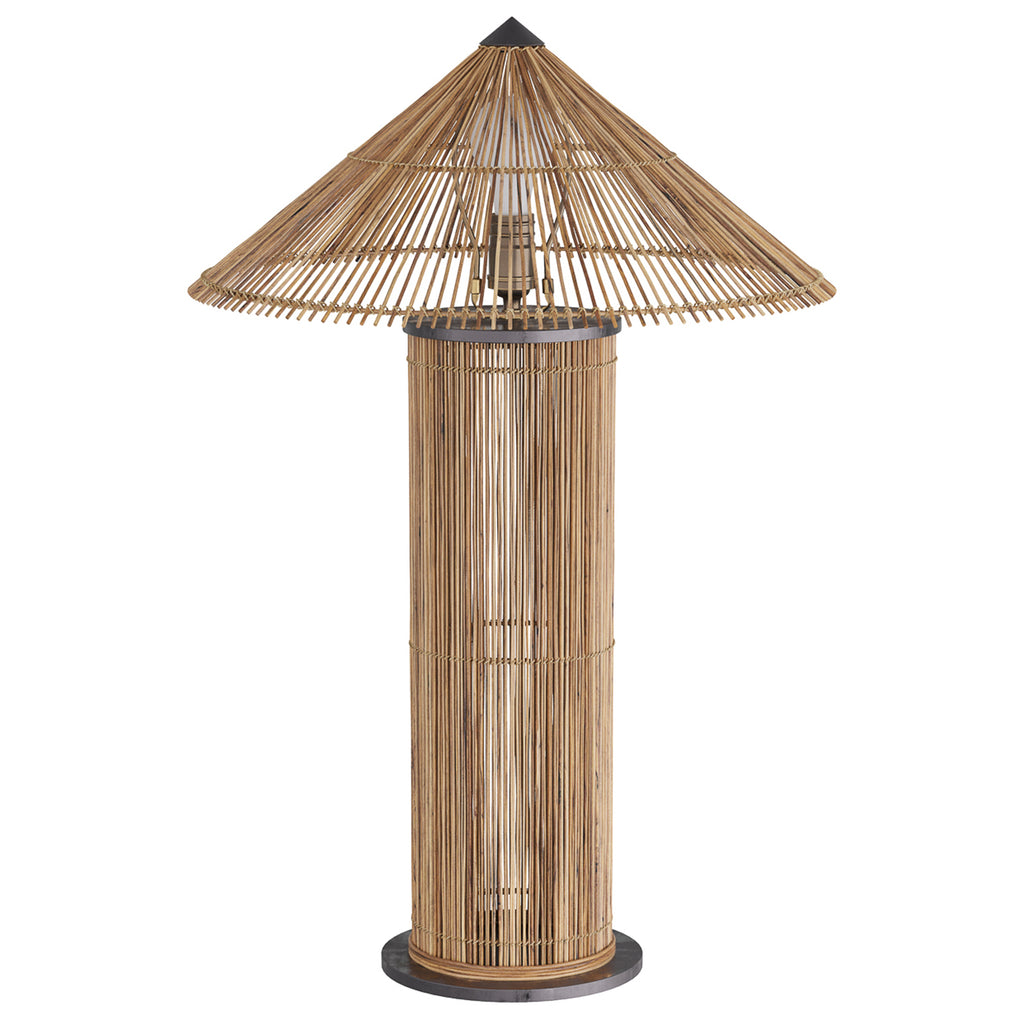 A tapered shade of natural rattan is woven loosely to allow the play of light and shadow across any surface. Complemented by a base of rattan and bronze, the Arteiors Belize’s classic silhouette allows it to live with a myriad of decorative styles. Capped with a triangular bronze finial. Black cord and on/off rotary switch. Finish will vary.